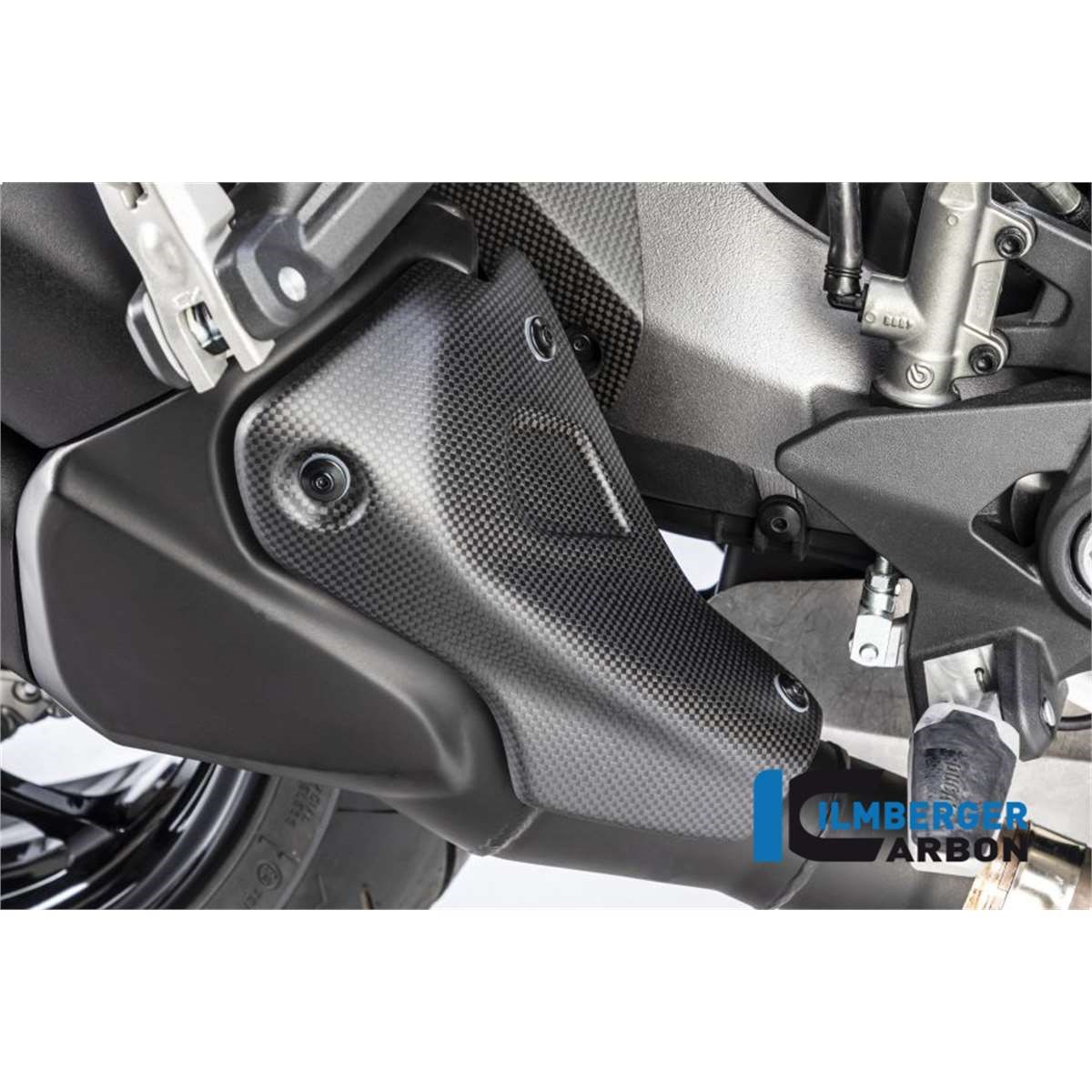 Der Auspuffhitzeschutz am Krümmer für die Ducati 1200 und 1200 S ab 2017 ersetzt das originale Bauteil unter Verwendung der originalen Befestigungspunkte. Für die Produktion von Teilen die in Auspuffnähe angebaut werden, wird bei uns ein sehr spezielles Hochtemperatur Prepreg Material verwendet um Verfärbungen und Abbrand des Carbons aus heutiger technischer Sicht so gering wie möglich zu halten.