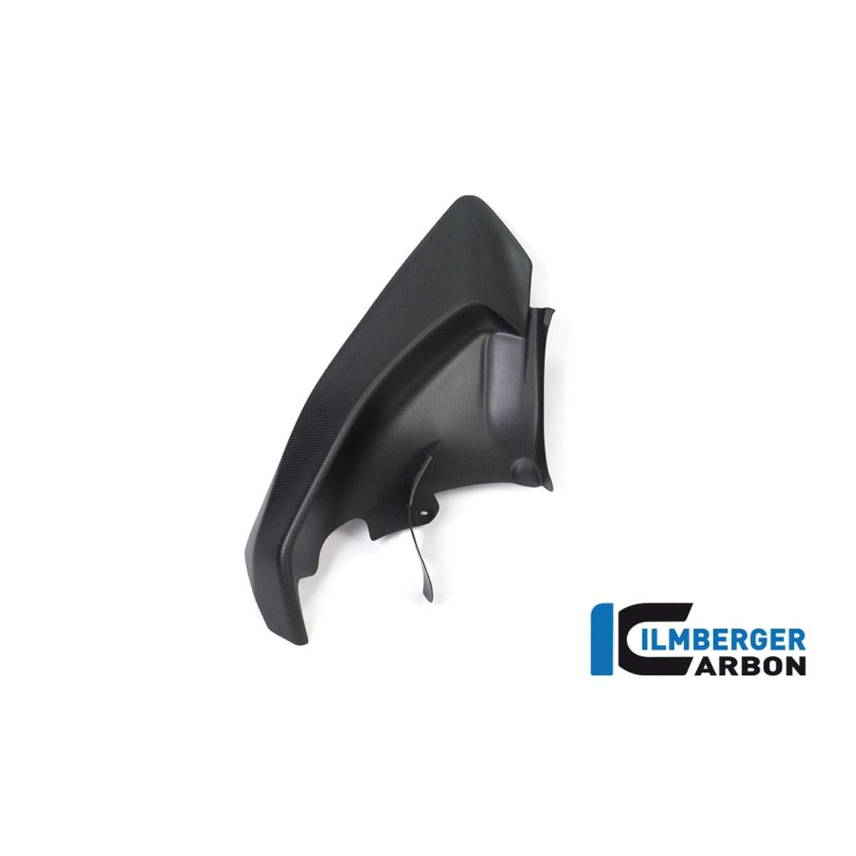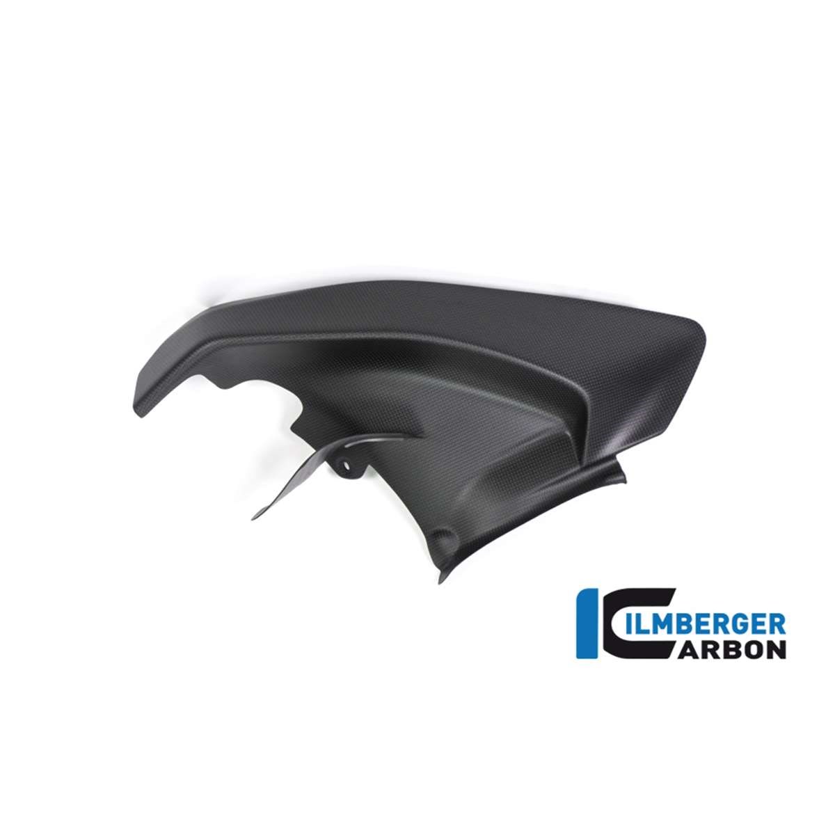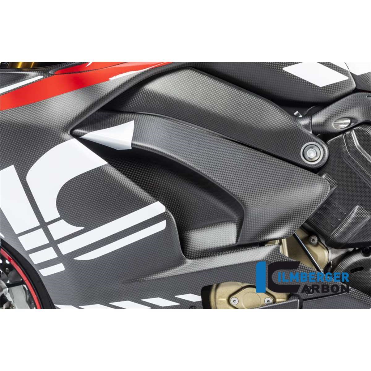 Die Abdeckung unter dem Rahmen (links) ersetzt das dortige Originalteil. Die Ilmberger Carbon Abdeckung wird an den serienmäßigen Punkten verschraubt. Das Carbonteil wird mit matter Oberfläche ausgeliefert und paßt damit hervorragend zu den teilweise serienmäßigen, bzw. von Ducati Performance angebotenen, matten Carbonteilen.