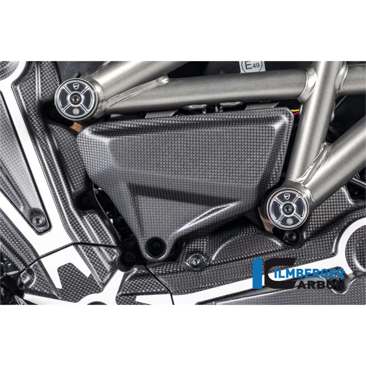 Die Abdeckung unter dem Rahmen in Carbon, matte Ausführung, für die Ducati XDiavel (ab Baujahr 2016), rechte Fahrzeugseite, ersetzt das originale Bauteil und wird an vorhandenen Haltepunkten am Fahrzeug aufgeschraubt.
