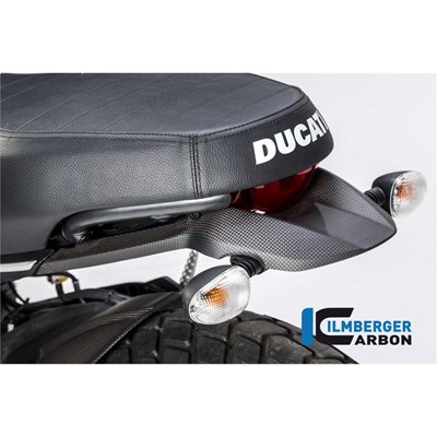 Der hintere Blinkerhalter in Carbon und glänzender Ausführung für die Ducati Scrambler ab 2016 wird an vorhandenen Haltepunkten am Fahrzeug aufgeschraubt.