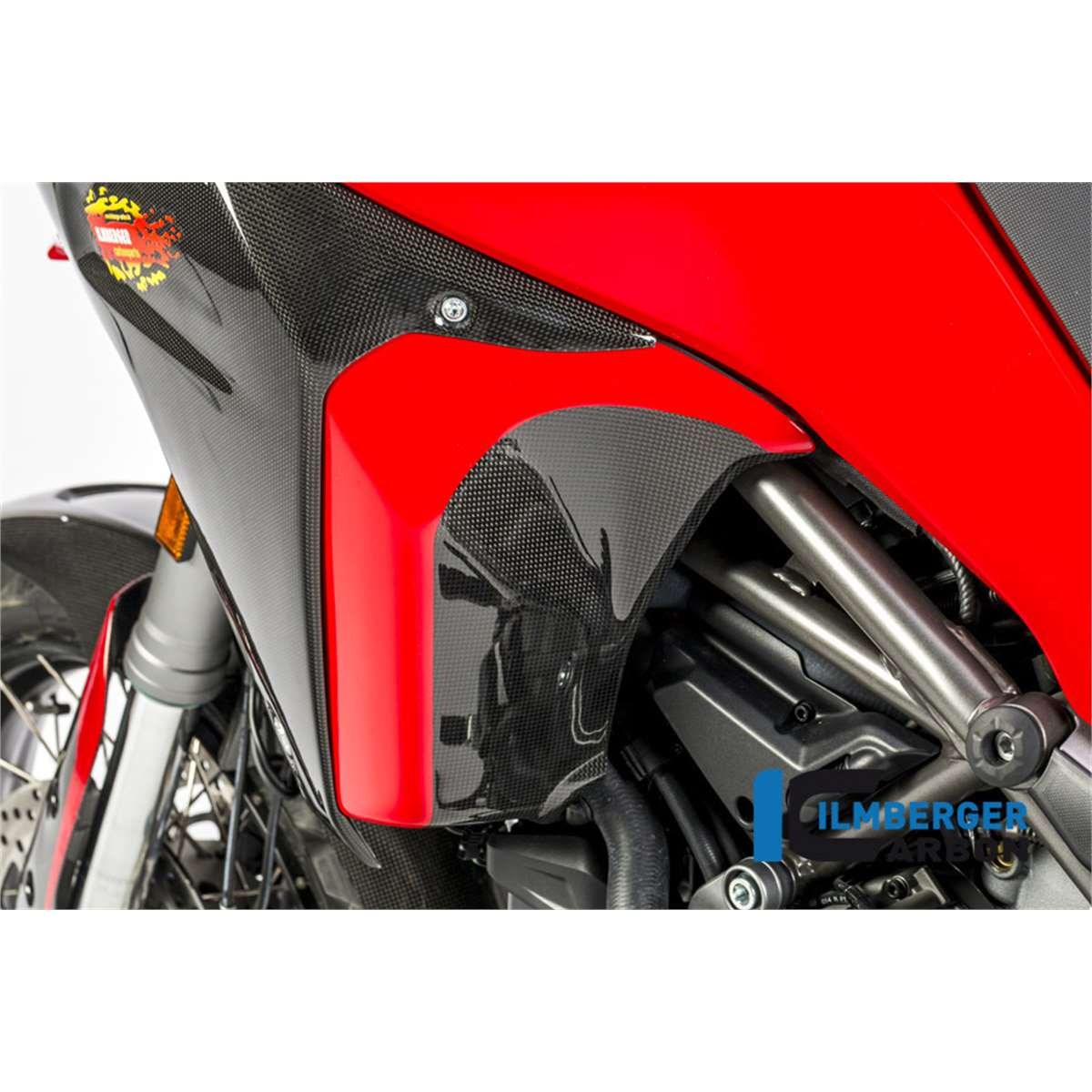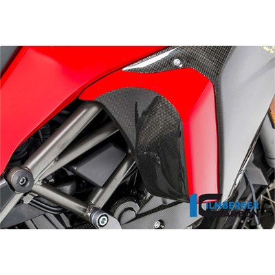 Die Abdeckung ist deutlich leichter als das Original und sorgt an den Flanken des Motorrades für zusätzliche Stabilität. Der sportliche Anspruch der Multistrada Enduro wird durch dieses großflächige Carbonteil auch optisch unterstrichen.