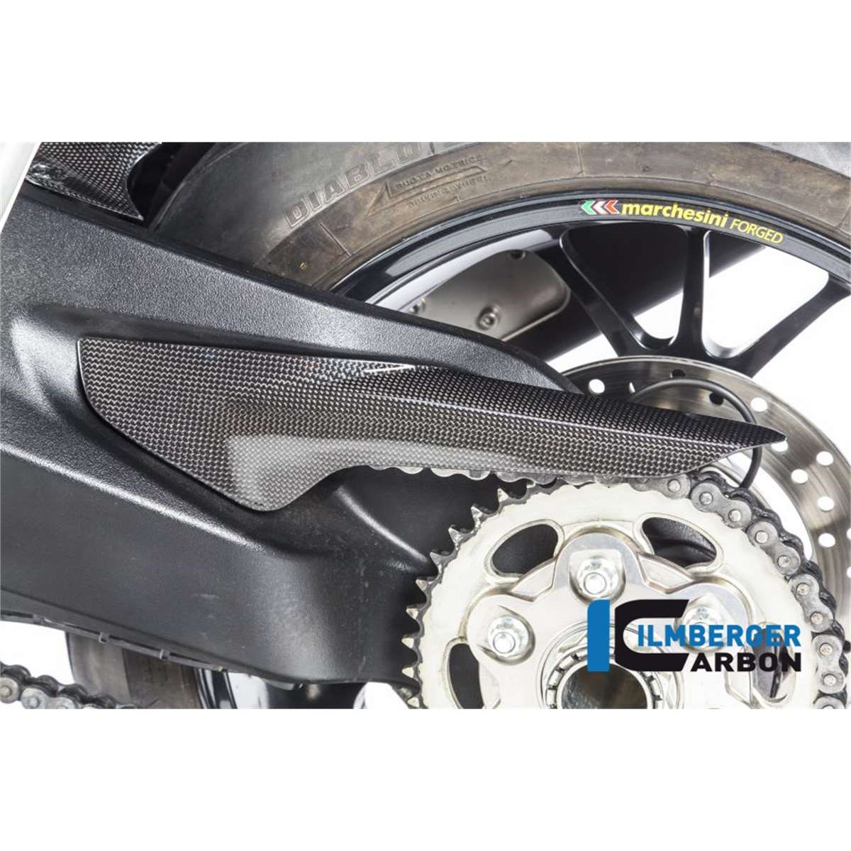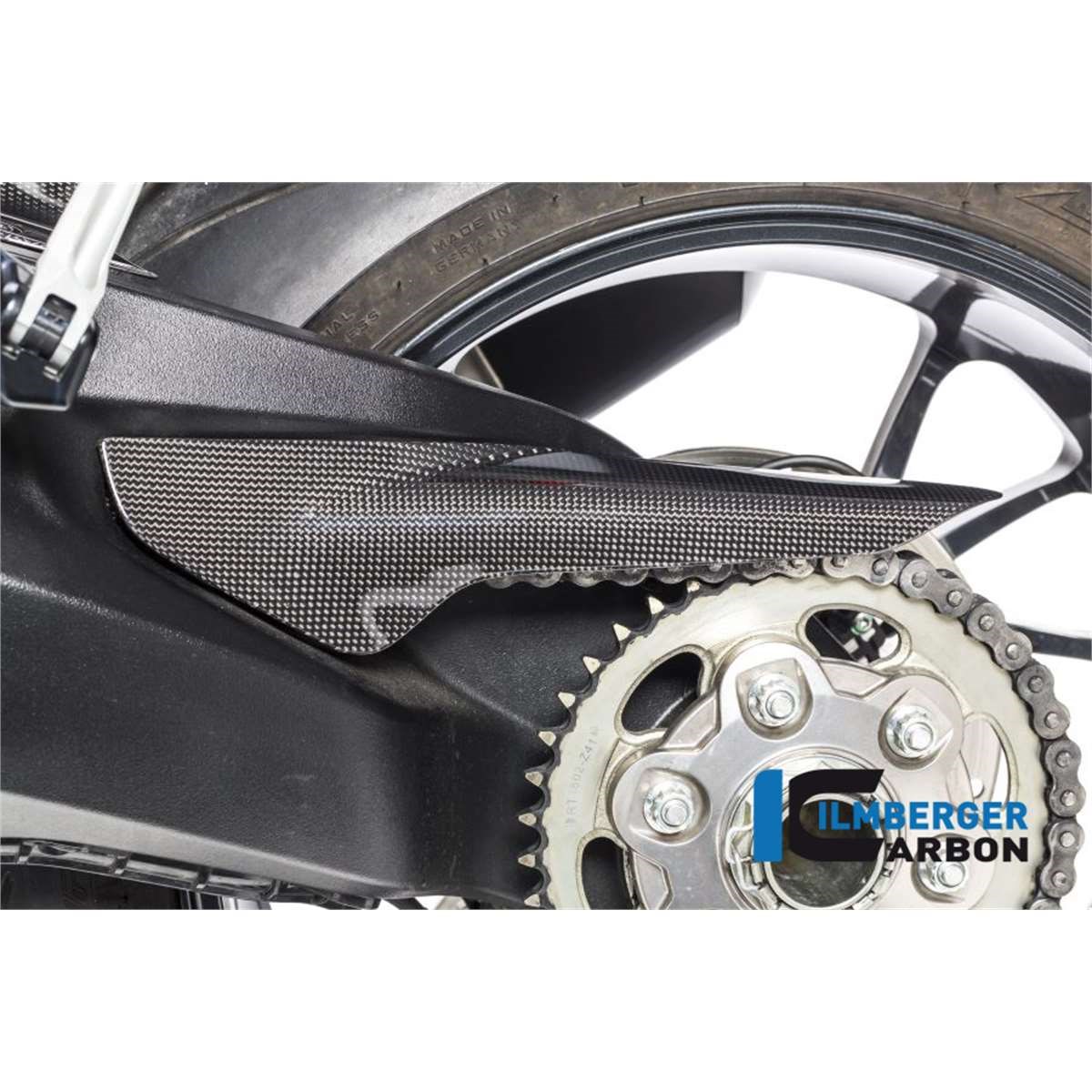 Der Kettenschutz in Carbon für die Ducati Monster 1200, 1200 S und 1200 R ersetzt das originale Bauteil unter Verwendung der originalen Befestigungspunkte. Im Vordergrund stehen Gewichtsersparnis (in der Regel Einsparung von ca. 70% im Vergleich zum originalen Bauteil) und höhere Steifigkeit. Das Carbonteil wurde nach den neuesten Richtlinien im Autoklaven komplett aus Prepreg (siehe FAQ) Material gefertigt und im nächsten Schritt, wie bei uns üblich, zum Schutz gegen Umwelteinflüße mit einer klaren Kunststoffbeschichtung überzogen. Diese Kunststoffbeschichtung übertrifft den sonst üblichen Klarlacküberzug in der Schutzwirkung, Kratzfestigkeit und Beständigkeit enorm. Aber nicht nur technisch kann die Beschichtung punkten, sondern sie unterstreicht auch die dreidimensionale Wirkung der Carbonstruktur nochmals deutlich. Die Gewebestruktur der angebotenen Teile passt optisch sehr gut zu den im Original von Ducati angebotenen Teilen. Der Kettenschutz für die Ducati Monster 1200 und 1200 S wird mit glänzend lackierter Oberfläche geliefert.