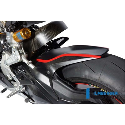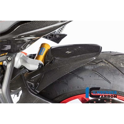 Die Hinterradabdeckng (Kotflügel hinten lange Version) in Carbon für die neue Ducati Monster 1200 und Monster 1200 S ersetzt das originale Bauteil unter Verwendung der originalen Befestigungspunkte. Im Vordergrund stehen Gewichtsersparnis (in der Regel Einsparung von ca. 70% im Vergleich zum originalen Bauteil) und höhere Steifigkeit. Das Carbonteil wurde nach den neuesten Richtlinien im Autoklaven komplett aus Prepreg (siehe FAQ) Material gefertigt und im nächsten Schritt, wie bei uns üblich, zum Schutz gegen Umwelteinflüße mit einer klaren Kunststoffbeschichtung überzogen. Diese Kunststoffbeschichtung übertrifft den sonst üblichen Klarlacküberzug in der Schutzwirkung, Kratzfestigkeit und Beständigkeit enorm. Aber nicht nur technisch kann die Beschichtung punkten, sondern sie unterstreicht auch die dreidimensionale Wirkung der Carbonstruktur nochmals deutlich.