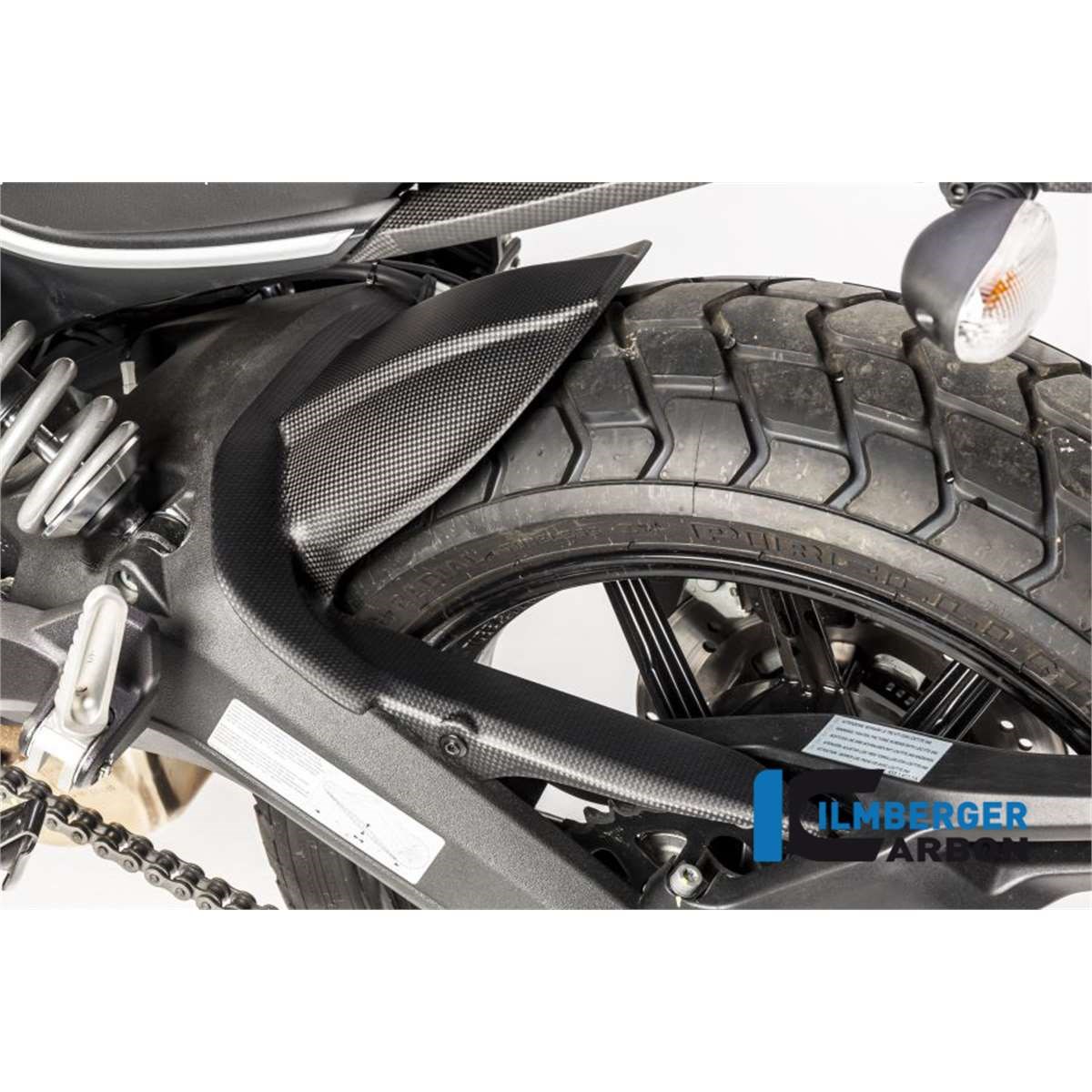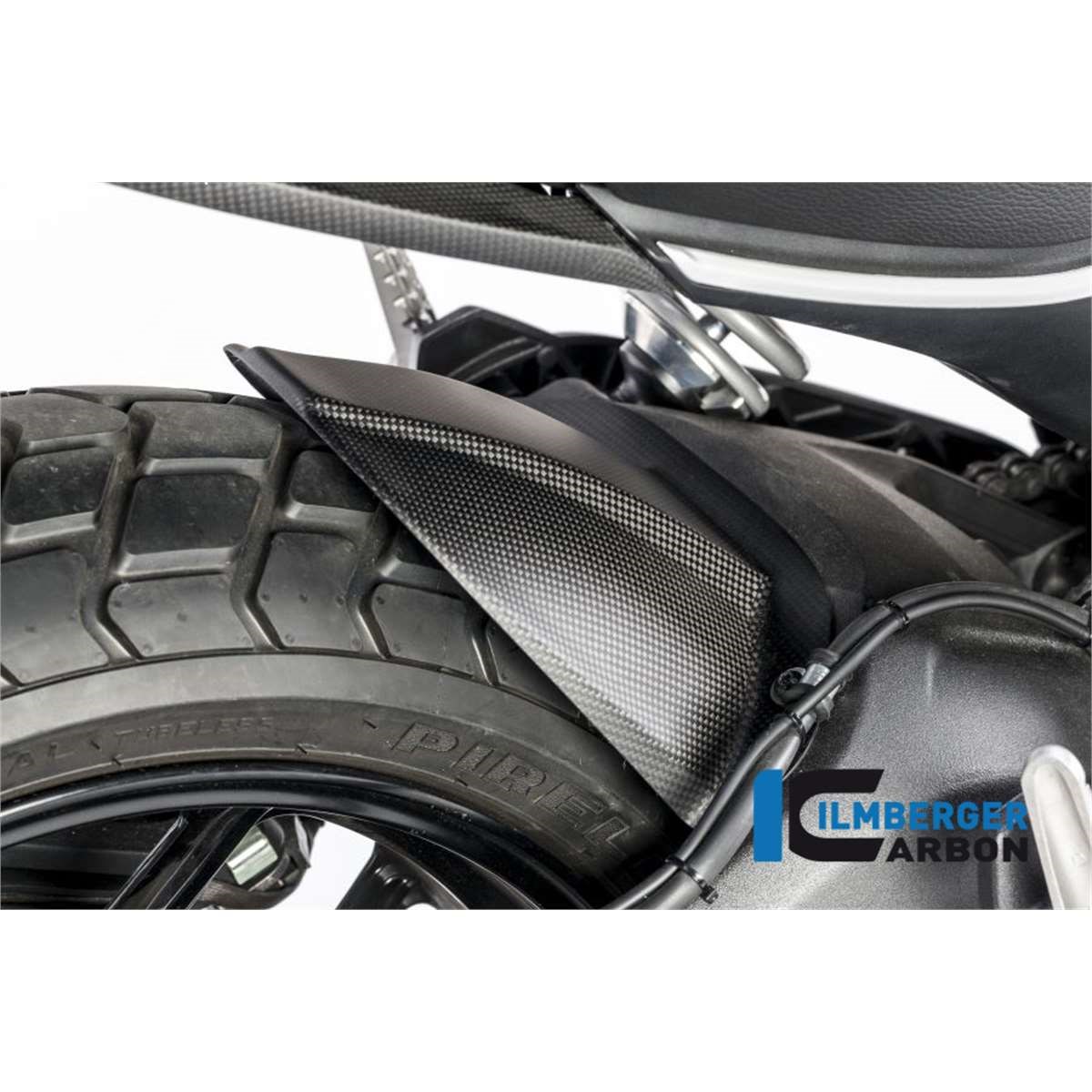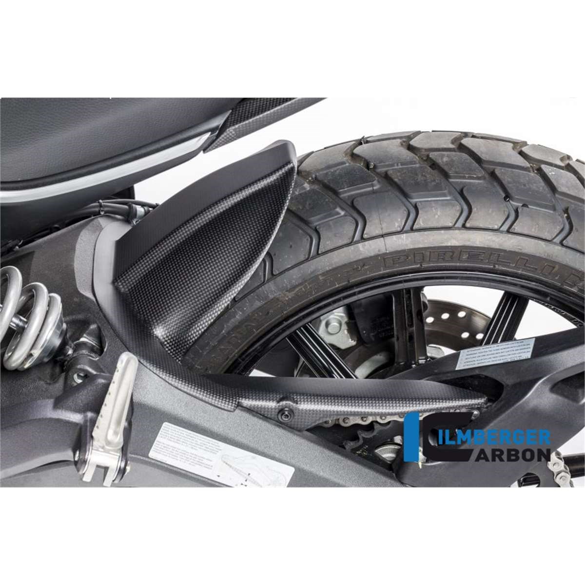 Der hintere Kotflügel in Carbon und matter Ausführung für die Ducati Scrambler ab 2016 wird an vorhandenen Haltepunkten am Fahrzeug aufgeschraubt.
