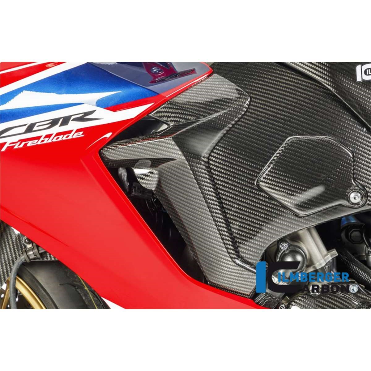 Die linke Luftauslassverkleidung in Carbon mit unserem einzigartigen Design für die Honda CBR 1000 RR Fireblade 2017 fügt sich hervorragend in das Gesamtbild des Motorrades ein. Gerade im direkten Aufeinandertreffen mit dem glänzend lackierten Verkleidungsseitenteil, wirkt die originale, matte Plastik-Luftauslassverkleidung nicht besonders wertig. Die Ilmberger Carbon Luftauslassverkleidung verleiht der Blade auch in diesem, sehr auffälligen Bereich, die richtige Optik und sorgt durch den Einsatz der hochfesten Carbonfasern auch noch für eine erhöhte Stabilität der Konstruktion. Natürlich kann die Luftauslassverkleidung auch ohne die, bei Ilmberger Carbon unter der Artikelnummer RAL.016.CBR17.K erhältliche, linke Rahmenabdeckung montiert werden.