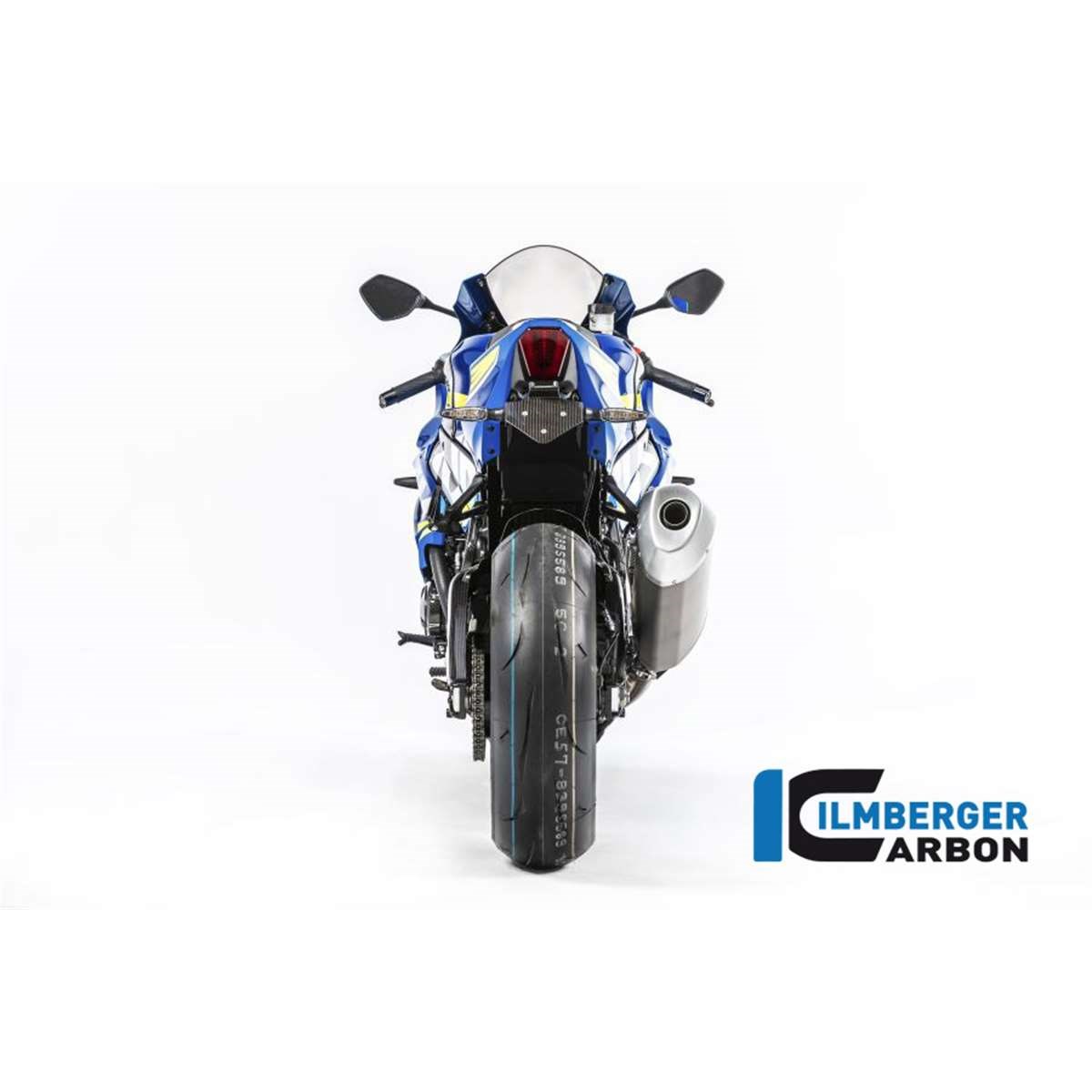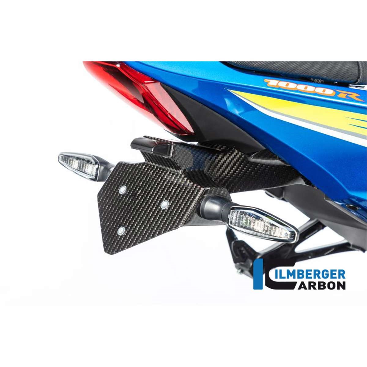 Der Kennzeichenträger in Carbon für die Suzuki GSX R 1000 ab 2017 ersetzt das originale Bauteil unter Verwendung der originalen Befestigungspunkte. Unser federleichter, aber dennoch extrem stabiler Kennzeichenträger kommt bereits fix und fertig mit integrierter, kompakter Kennzeichenbeleuchtung.  Er ermöglicht durch die bereits vorgefertigten Bohrungen natürlich auch die Montage der originalen LED Blinker.