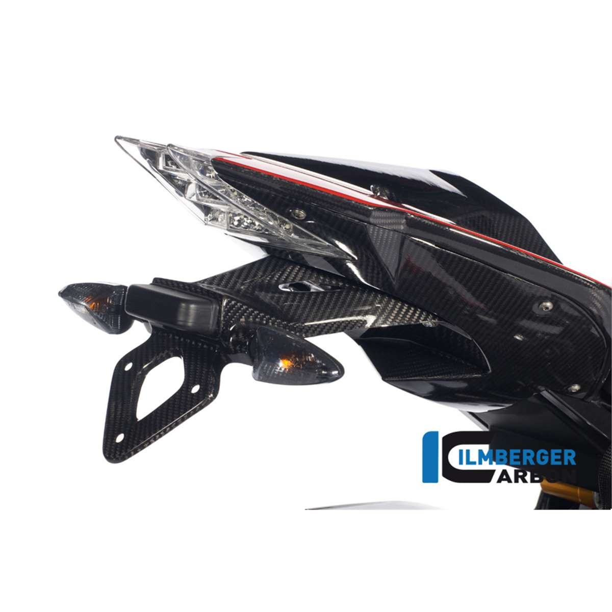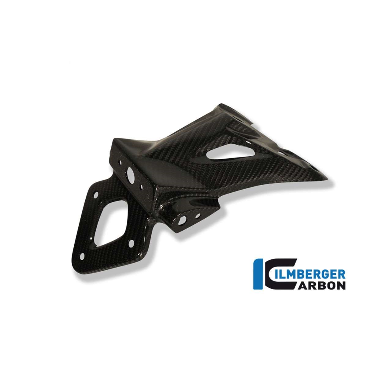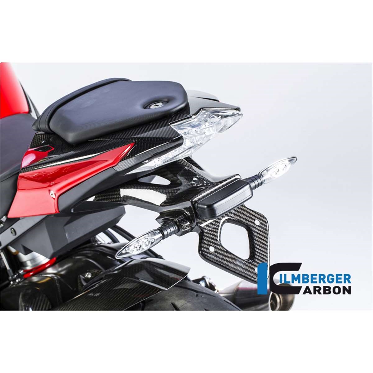 Der Kennzeichenträger in Carbon für dieBMW S 1000 R (2014-aktuell) / S 1000 RR Straße (2010-akuell) / HP 4 (2012-aktuell) ersetzt das originale Bauteil unter Verwendung der originalen Befestigungspunkte. Er ist etwas kürzer als das Originalteil gehalten. Das Heck des Motorrades wirkt dadurch etwas höher.