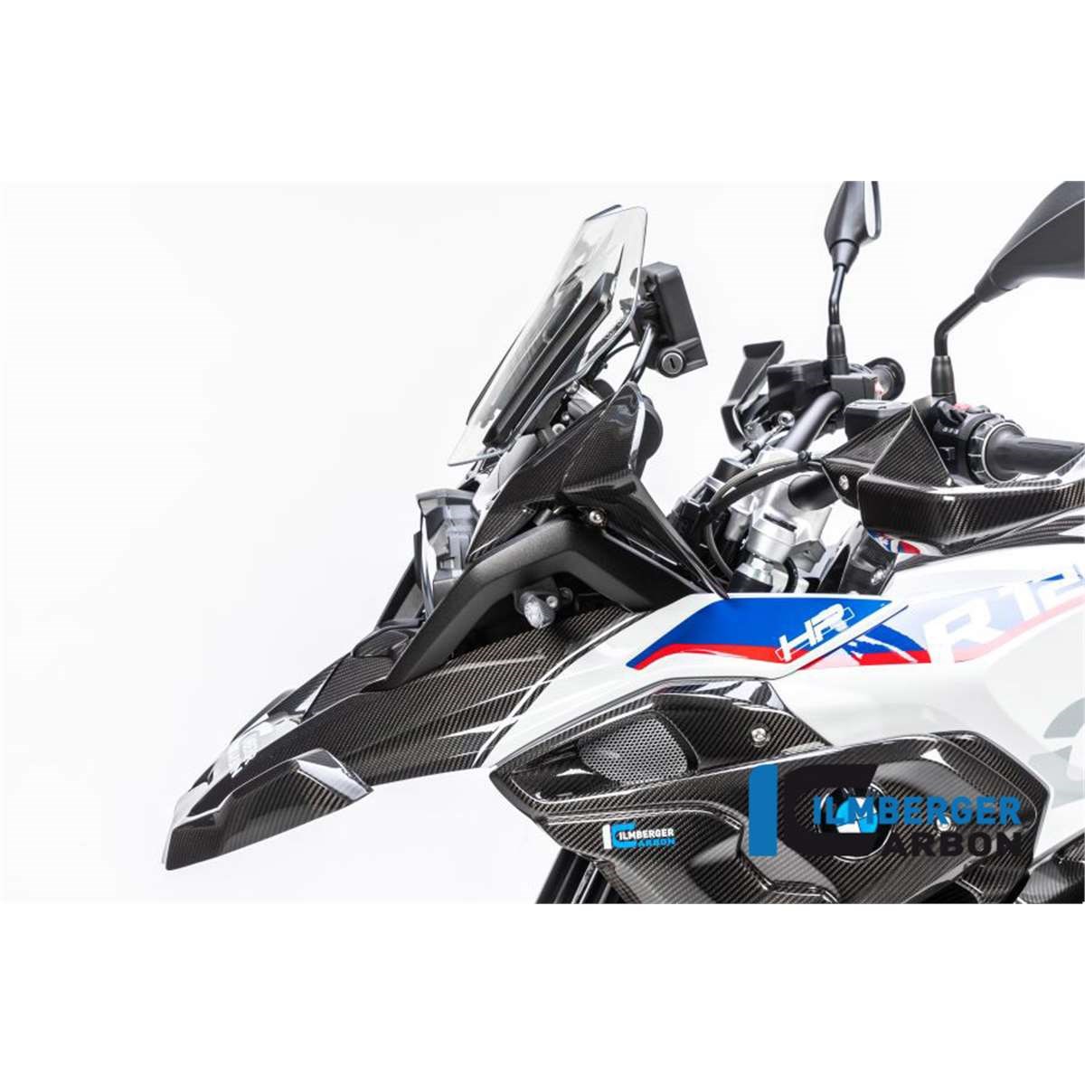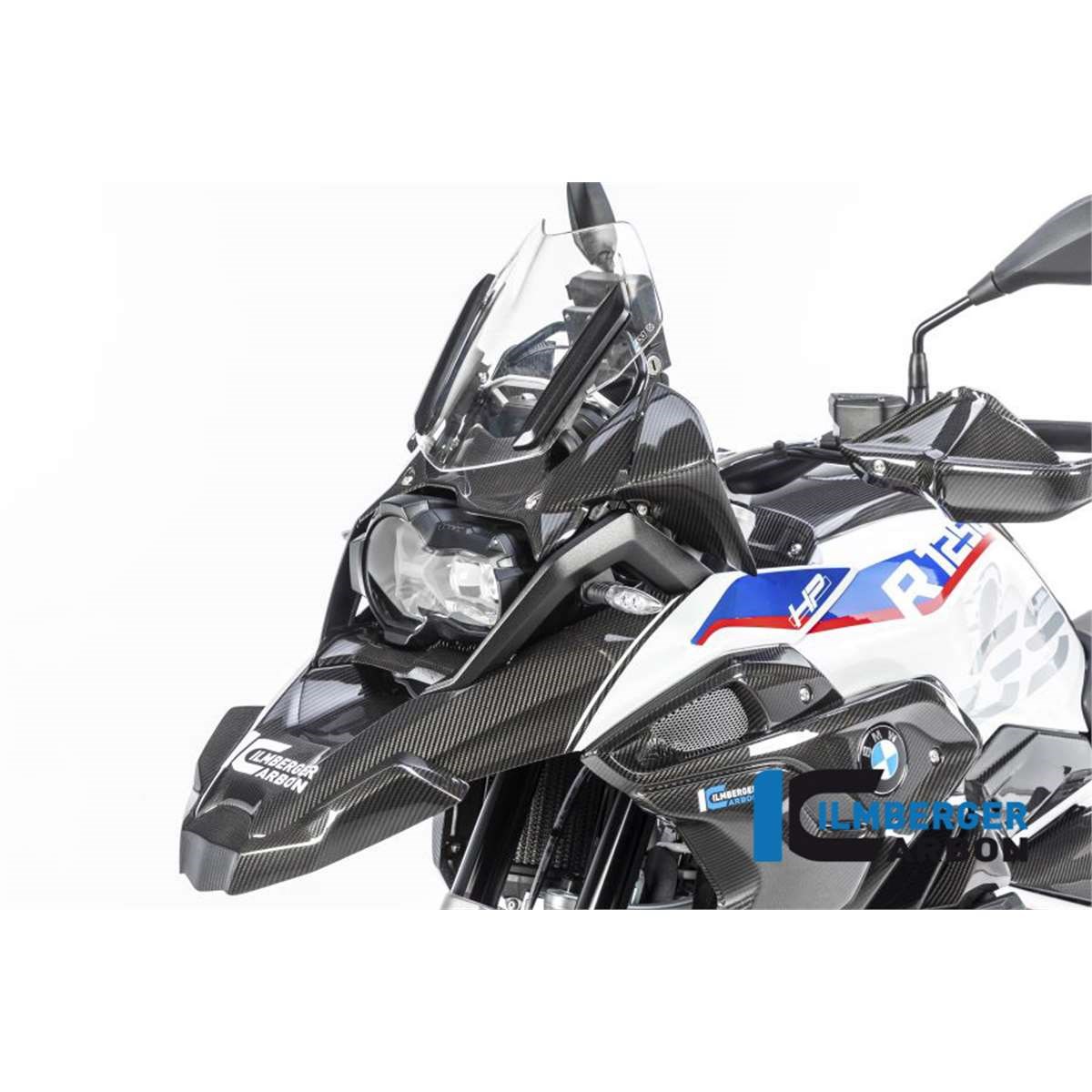 Der vordere obere Kotflügel für die BMW R 1250 GS ab Baujahr 2019 ersetzt das originale Bauteil unter Verwendung der originalen Befestigungspunkte. Im Vordergrund stehen Gewichtsersparnis (in der Regel Einsparung von ca. 70% im Vergleich zum originalen Bauteil) und höhere Steifigkeit.