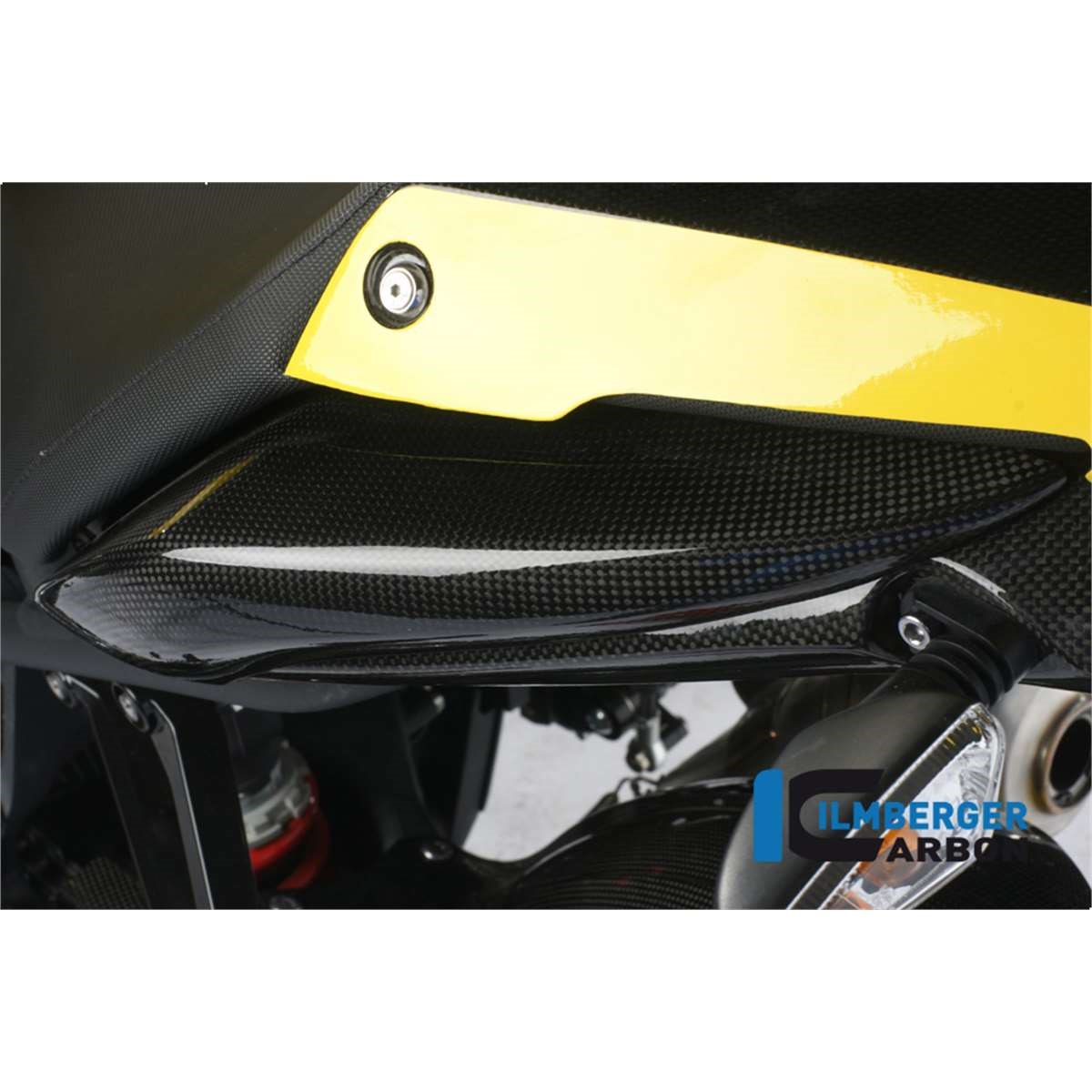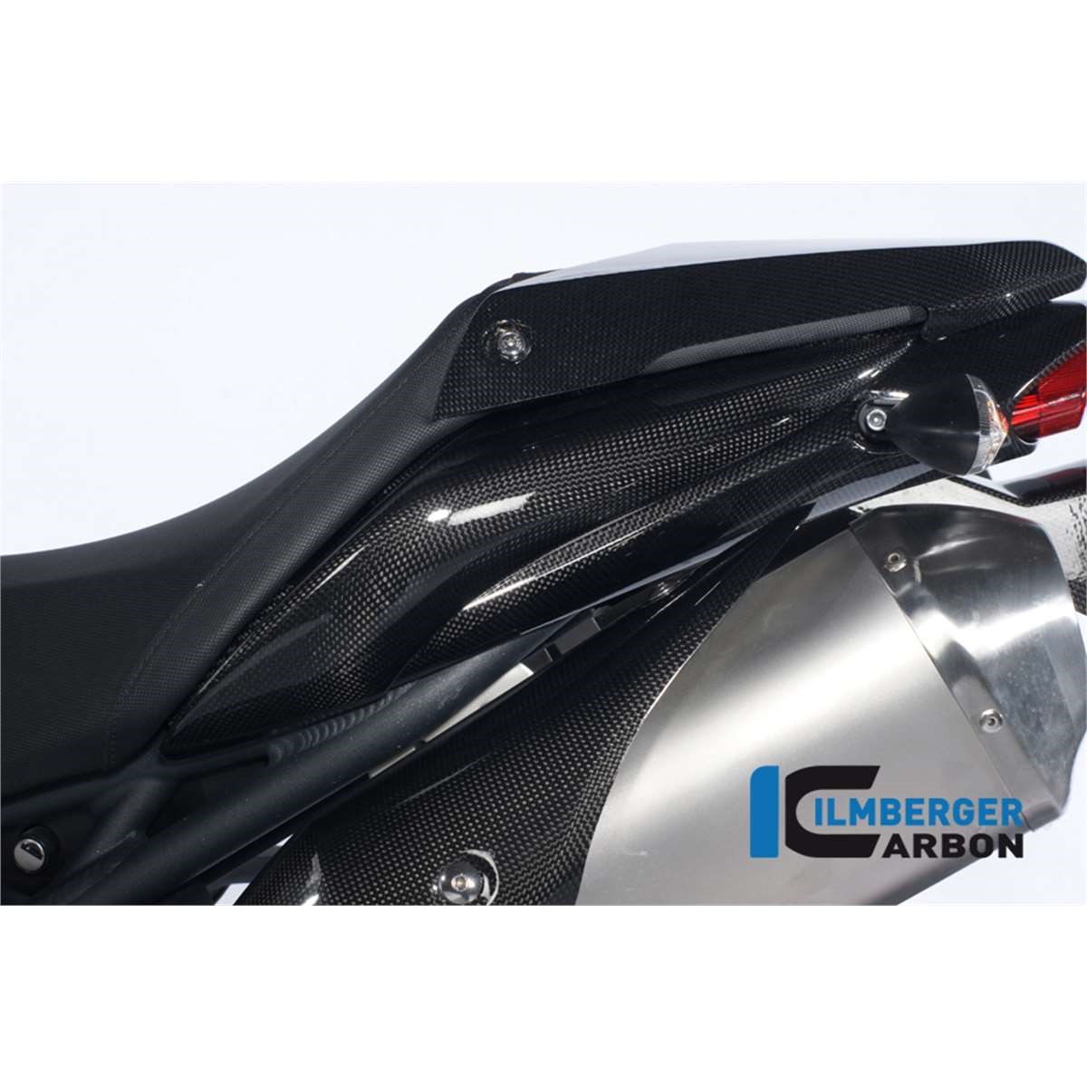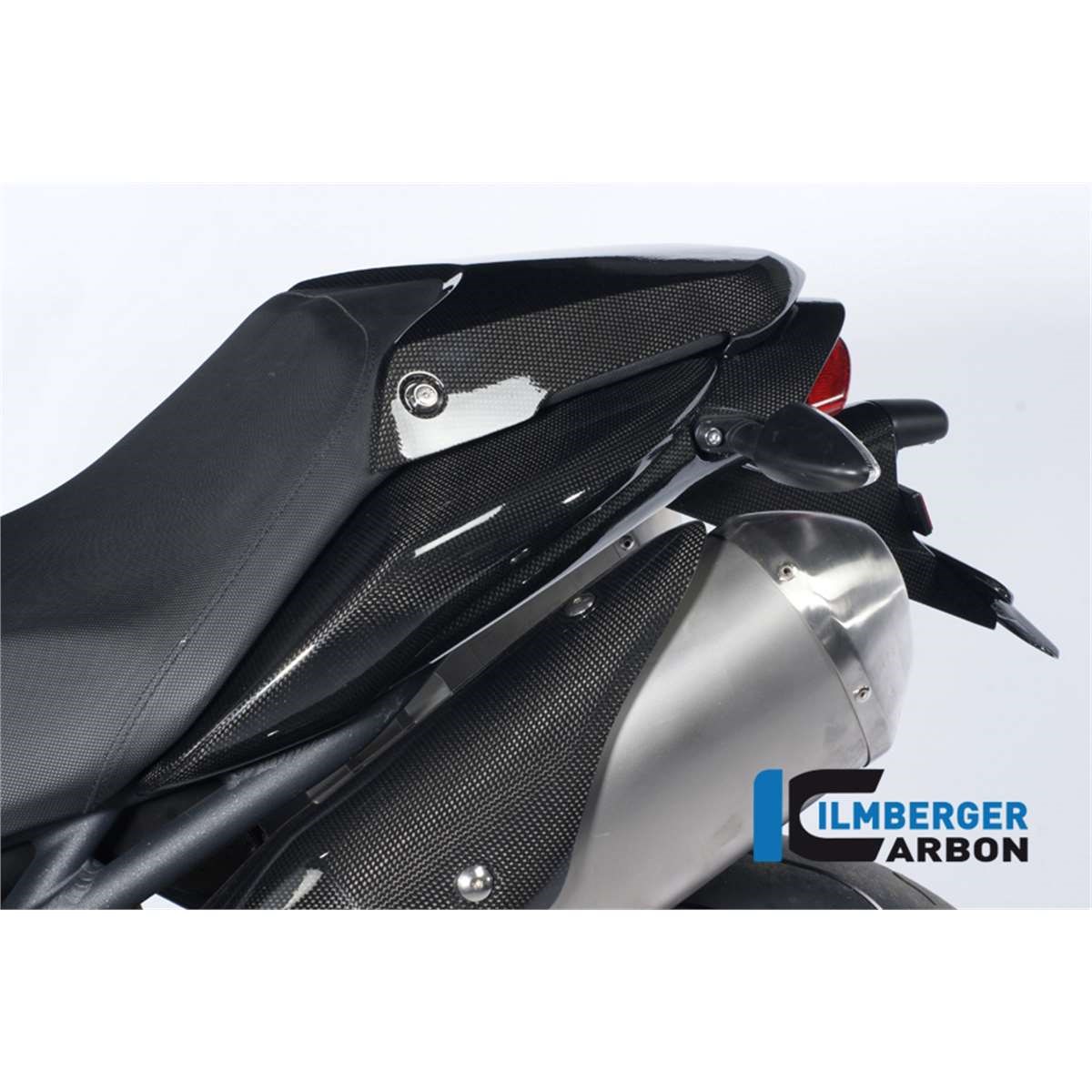 Der Seitendeckel unterm Sitz in Carbon für die Triumph Speed Triple ersetzt das originale Bauteil unter Verwendung der originalen Befestigungspunkte. Im Vordergrund stehen Gewichtsersparnis (in der Regel Einsparung von ca. 70% im Vergleich zum originalen Bauteil) und höhere Steifigkeit.  Das Carbonteil wurde nach den neuesten Richtlinien im Autoklaven komplett aus Prepreg (siehe FAQ) Material gefertigt und im nächsten Schritt, wie bei uns üblich, zum Schutz gegen Umwelteinflüße mit einer klaren Kunststoffbeschichtung überzogen.