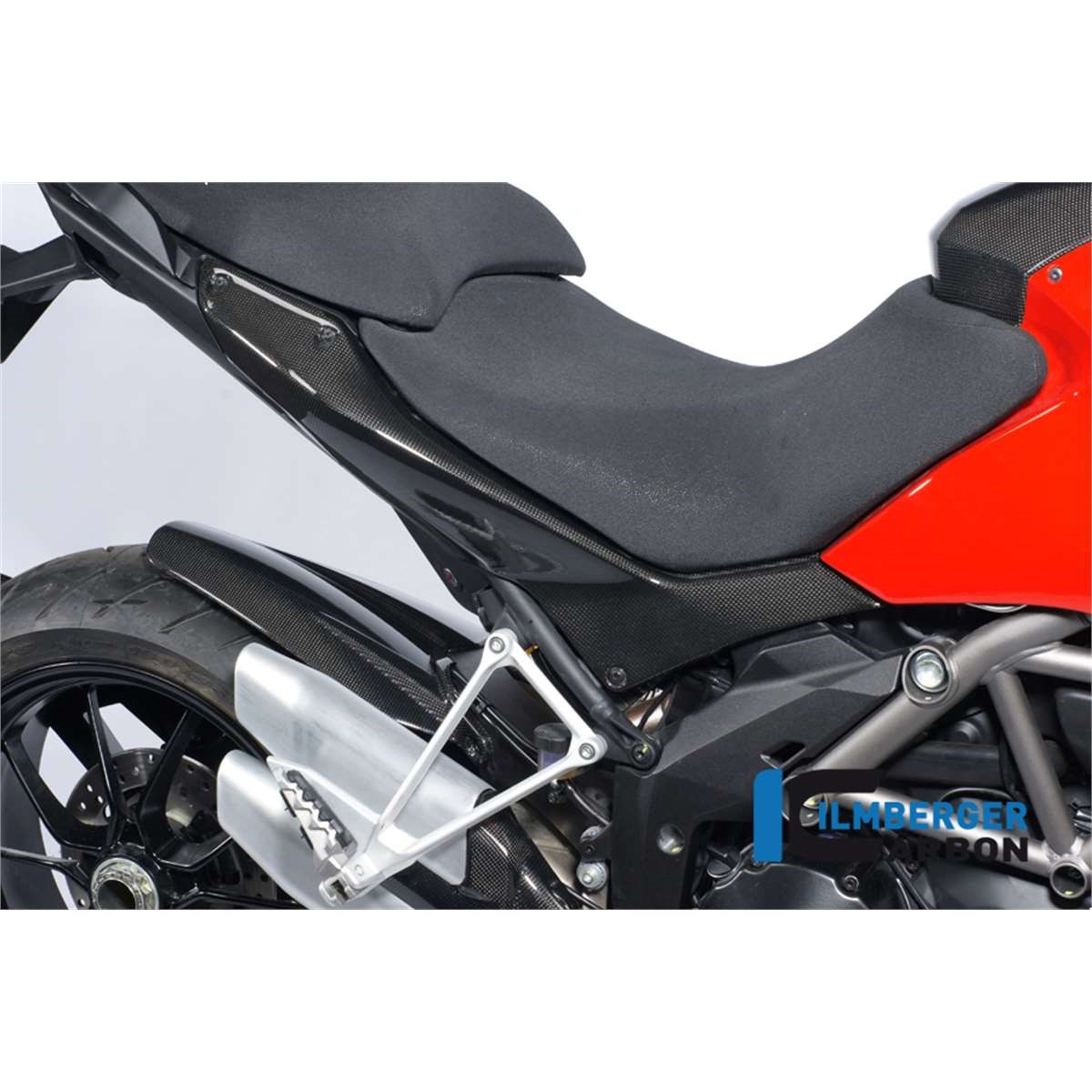 Der Seitendeckel unterm Sitz in Carbon für die Ducati Multistrada 1200 ersetzt das originale Bauteil unter Verwendung der originalen Befestigungspunkte. Im Vordergrund stehen Gewichtsersparnis (in der Regel Einsparung von ca. 70% im Vergleich zum originalen Bauteil) und höhere Steifigkeit. Das Carbonteil wurde nach den neuesten Richtlinien im Autoklaven komplett aus Prepreg (siehe FAQ) Material gefertigt und im nächsten Schritt, wie bei uns üblich, zum Schutz gegen Umwelteinflüße mit einer klaren Kunststoffbeschichtung überzogen.
