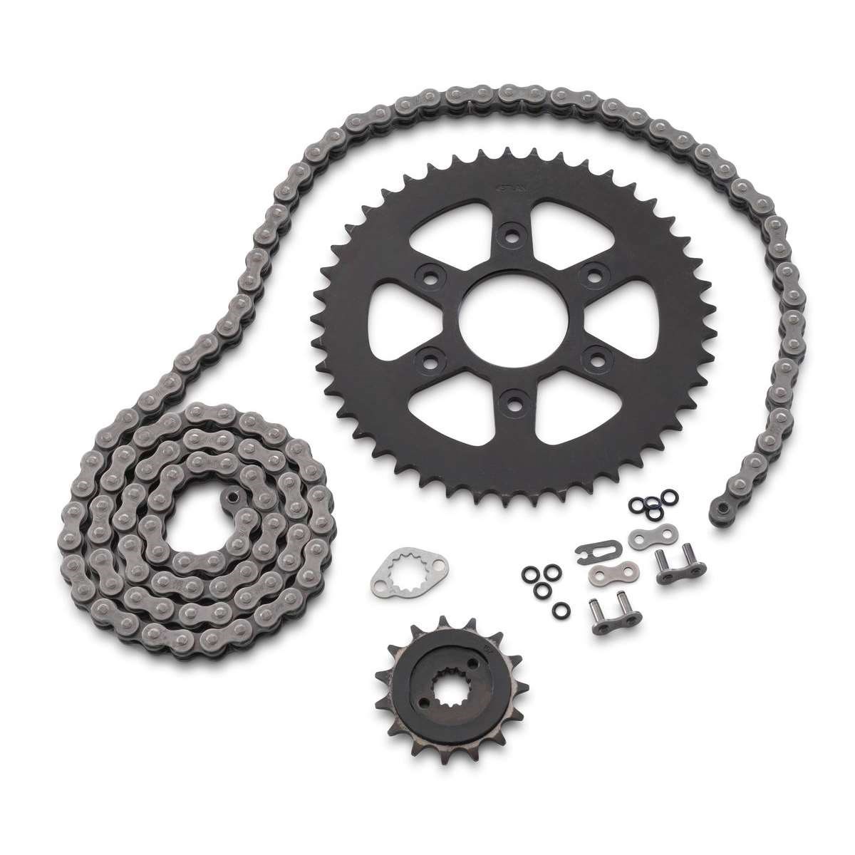 Der Antriebssatz besteht aus dem vorderen (16 Zähne) und dem hinteren Kettenrad (45 Zähne) und der Kette.