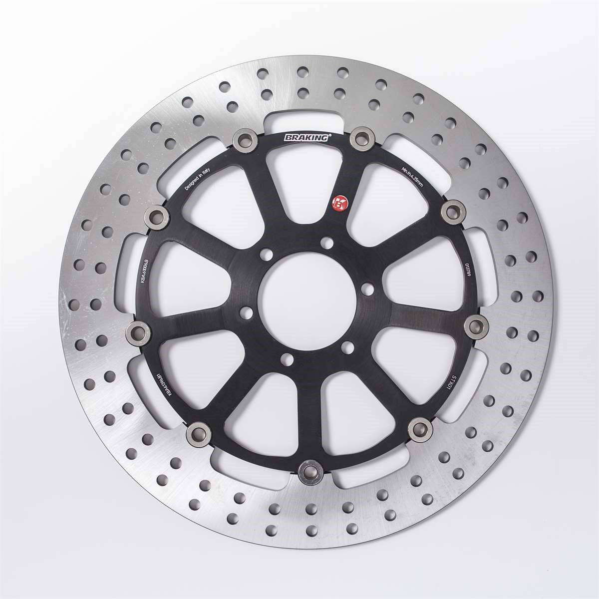 Bremsscheibe vollschwimmend mit gelochtem Stahlaussenring, Innenring aus Aluminium.