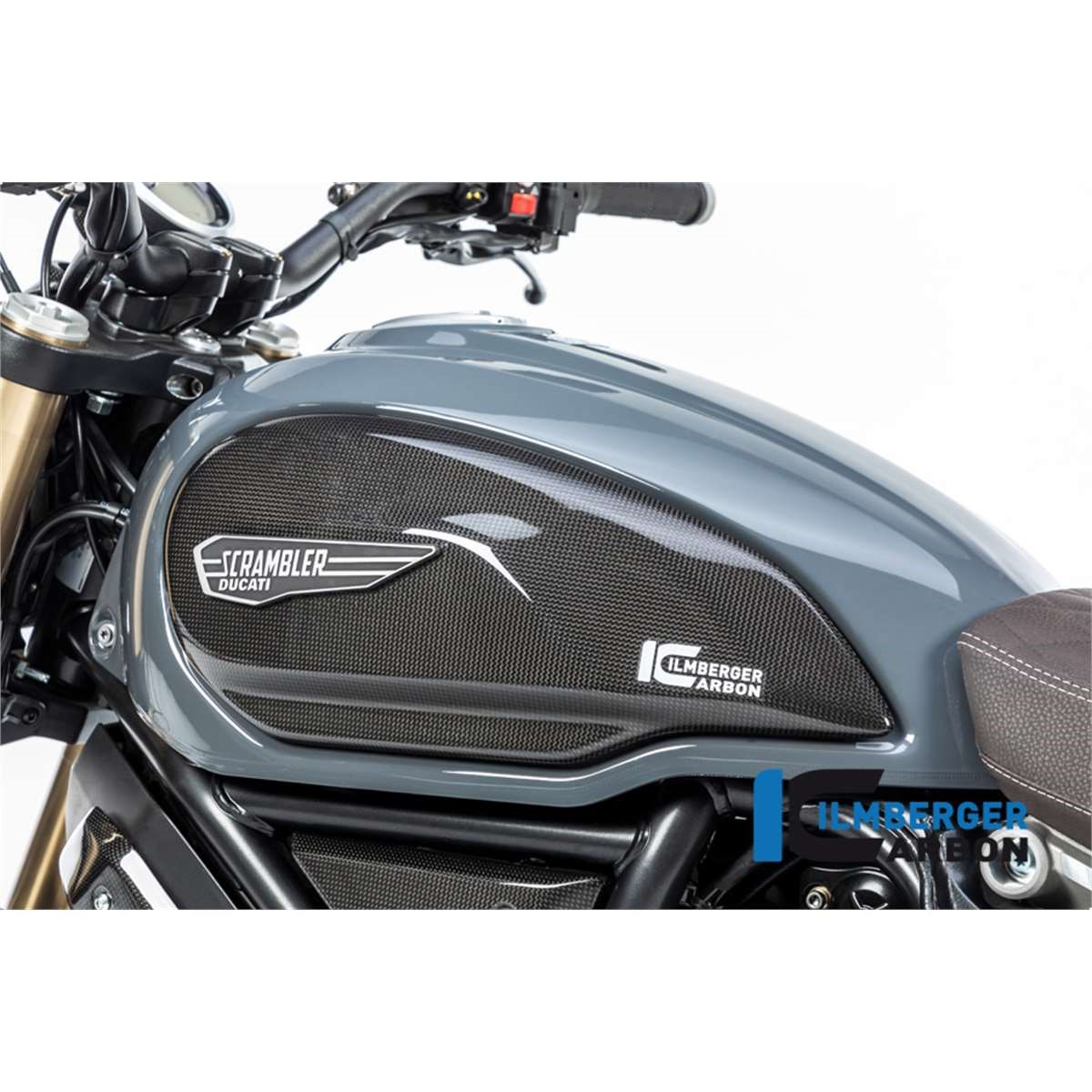 Die linke Tankabdeckung in Carbon und glänzender Ausführung für die Ducati Scrambler 1100 ab 2017 wird an vorhandenen Haltepunkten am Fahrzeug aufgeschraubt.