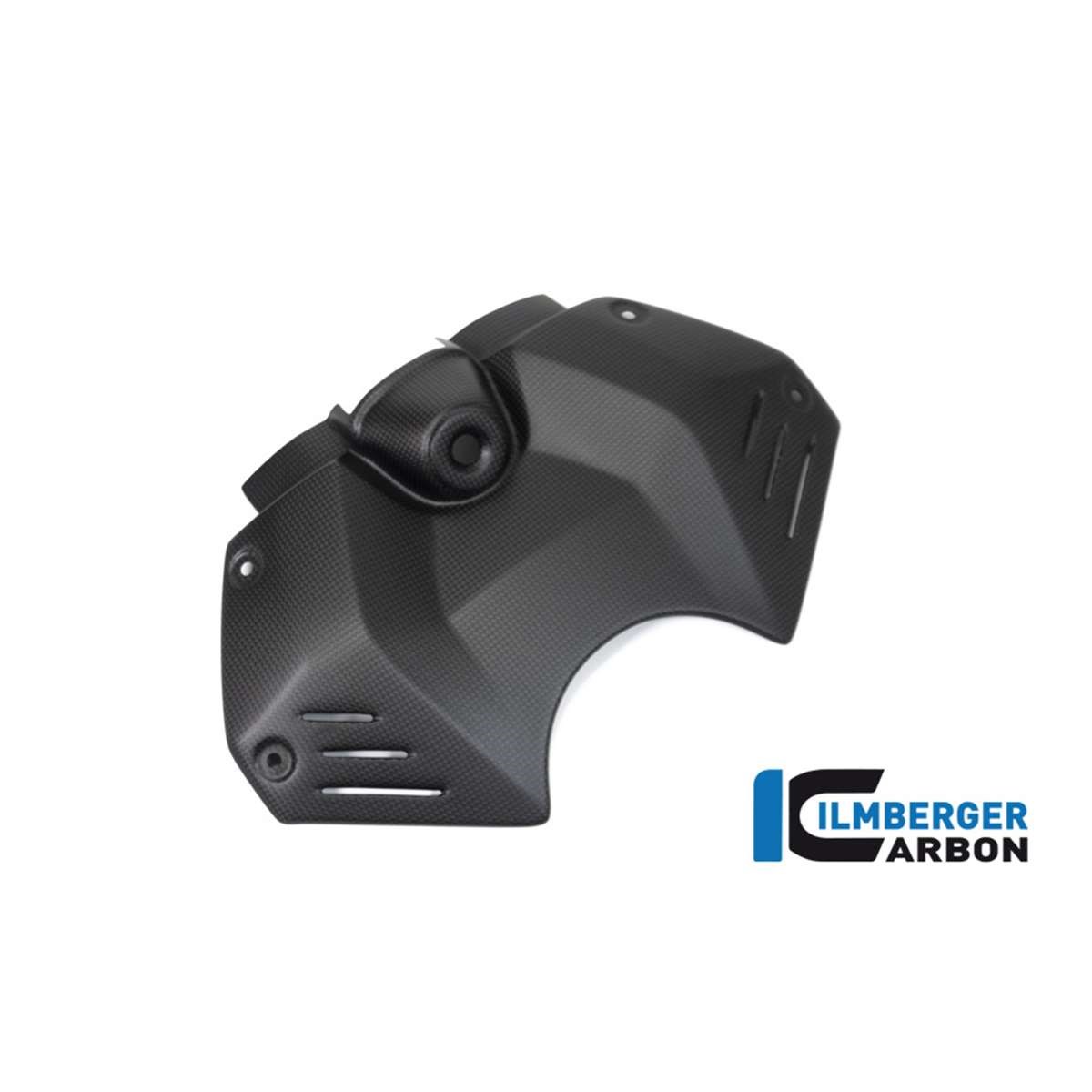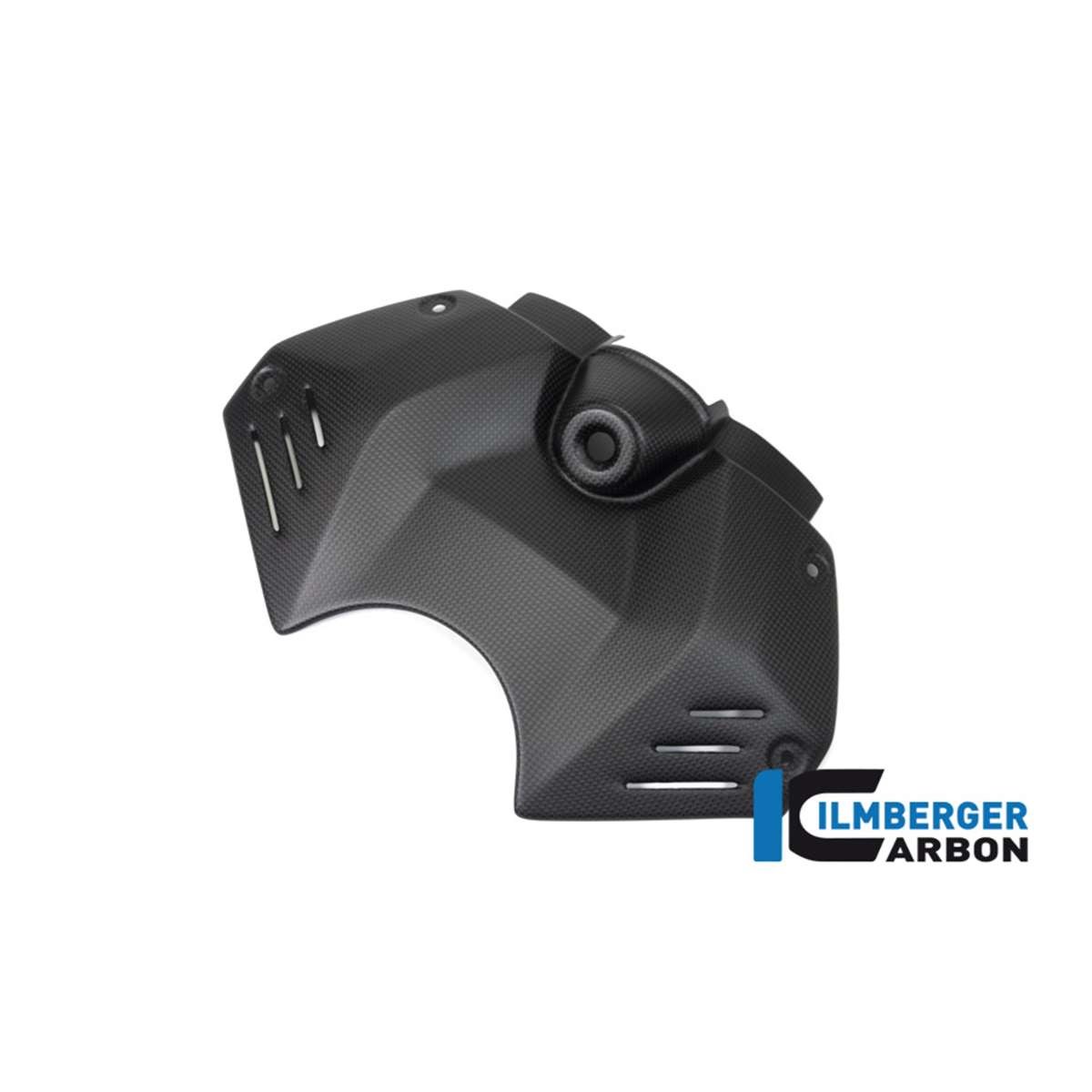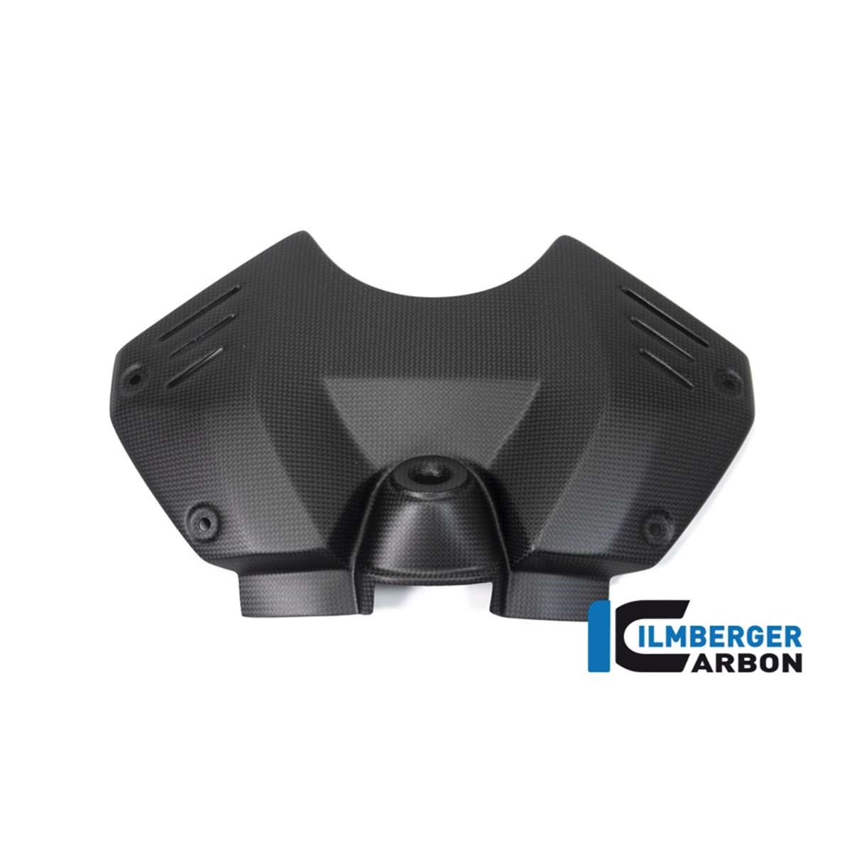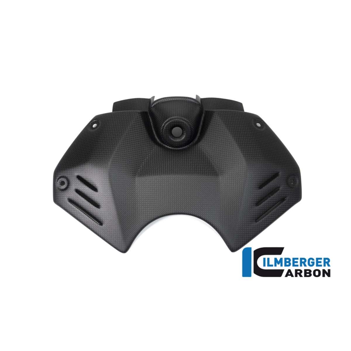 Die Tankabdeckung oben ersetzt das Originalteil unter Verwendung der originalen Aufnahmepunkte. Die Tankabdeckung verbindet die beiden oberen Verkleidungshälften und gibt der V4 R eine nochmals aggressivere Optik. Selbstverständlich ist das Ilmberger Carbonteil mit Aussparungen für die Motorabluft versehen. Das Carbonteil wird in glänzender Oberfläche ausgeliefert und steht damit im Kontrast zu den, von Ducati Performance angebotenen, matten Carbonteilen. Im Vordergrund stehen Gewichtsersparnis (in der Regel Einsparung von ca. 70% im Vergleich zum originalen Bauteil) und höhere Steifigkeit. Das Carbonteil wurde nach den neuesten Richtlinien im Autoklaven komplett aus Prepreg (siehe FAQ) Material gefertigt und im nächsten Schritt, wie bei uns üblich, zum Schutz gegen Umwelteinflüße mit einer klaren Kunststoffbeschichtung überzogen. Diese Kunststoffbeschichtung übertrifft den sonst üblichen Klarlacküberzug in der Schutzwirkung, Kratzfestigkeit und Beständigkeit enorm. Aber nicht nur technisch kann die Beschichtung punkten, sondern sie unterstreicht auch die dreidimensionale Wirkung der Carbonstruktur nochmals deutlich.