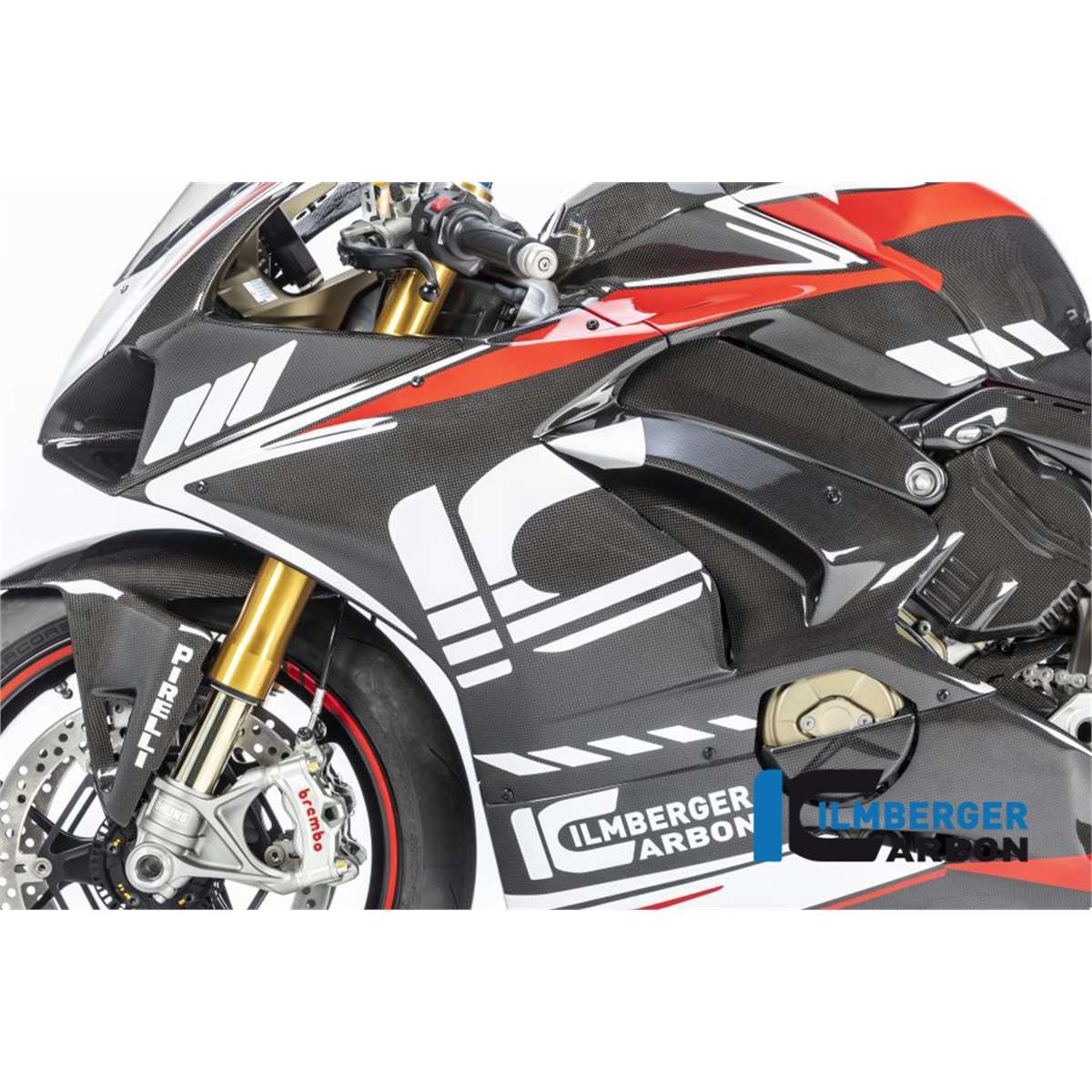 Das linke Verkleidungsseitenteil ist strömungstechnisch optimiert und verbessert durch die veränderte Luftführung die Kühlung der Motor- und Wassertemperatur signifikant. Der Motor bleibt dadurch deutlich kühler und leistungsfähiger. Die hochglänzende Oberfläche betont den sportlichen Charakter der Panigale V4 / V4 S Racing.