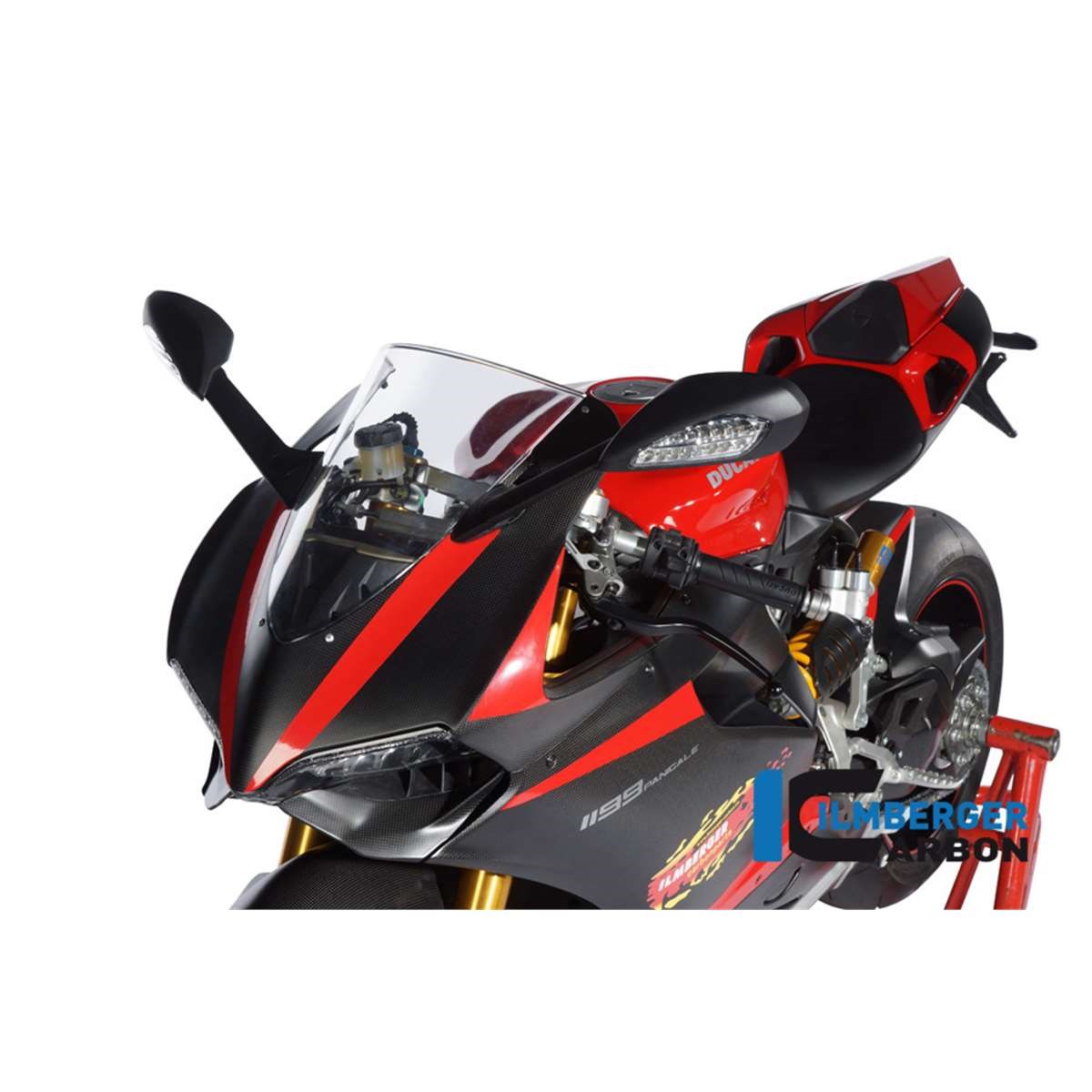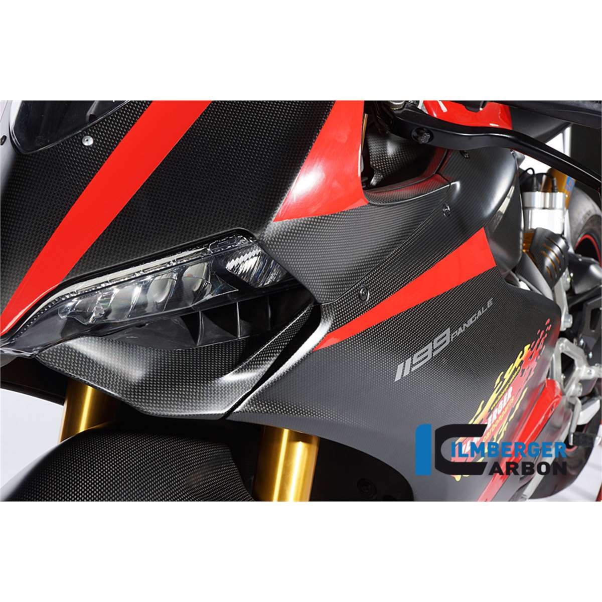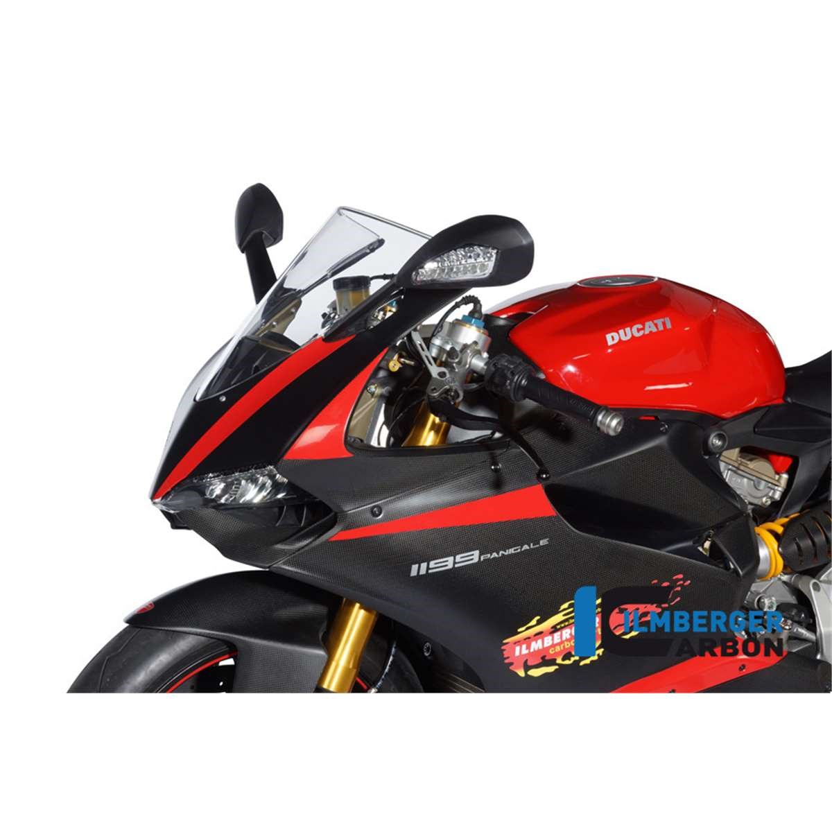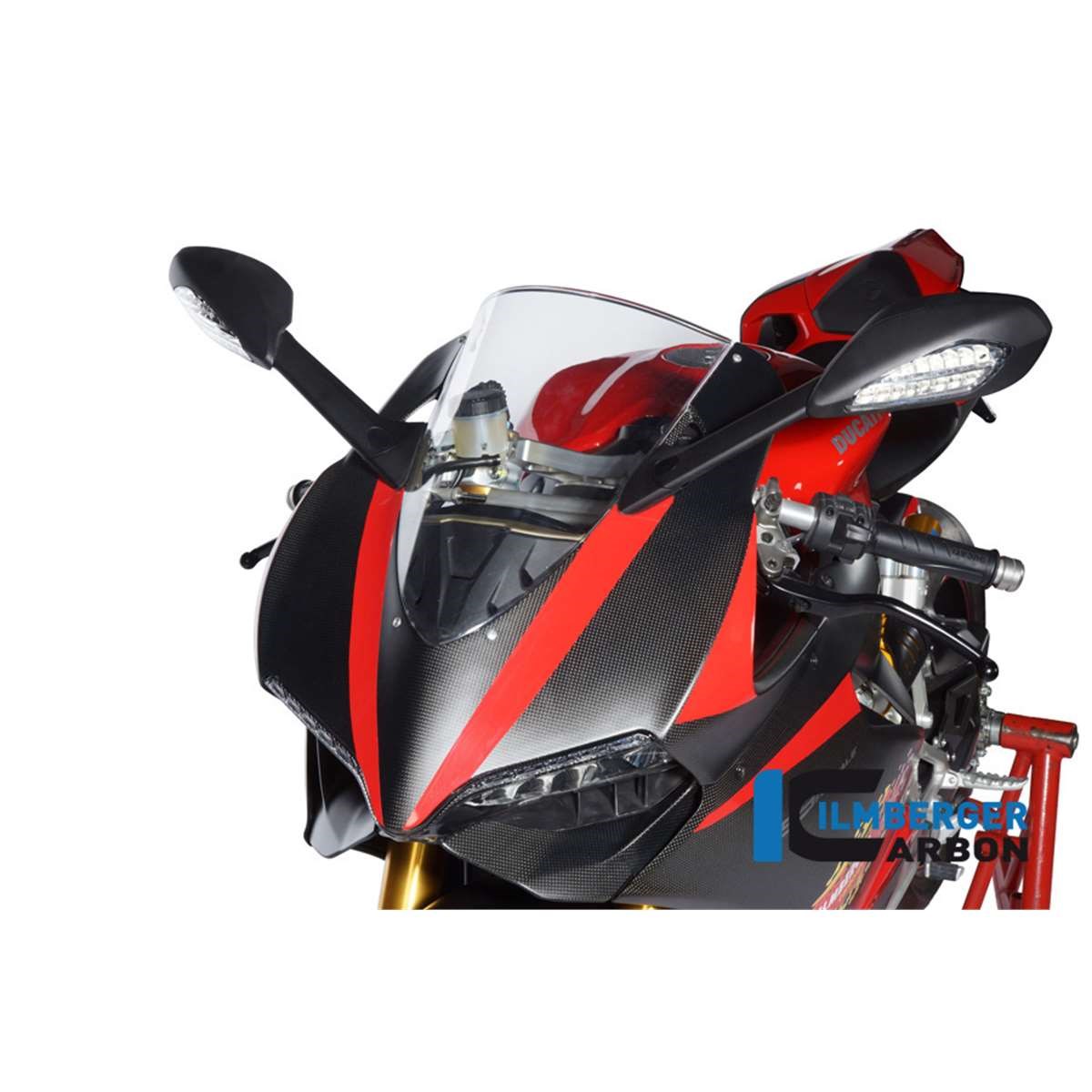 Das Verkleidungsoberteil in Carbon für die Ducati 1199 Panigale ersetzt das originale Bauteil unter Verwendung der originalen Befestigungspunkte. Im Vordergrund stehen Gewichtsersparnis (in der Regel Einsparung von ca. 70% im Vergleich zum originalen Bauteil) und höhere Steifigkeit.  Das Carbonteil wurde nach den neuesten Richtlinien im Autoklaven komplett aus Prepreg (siehe FAQ) Material gefertigt und im nächsten Schritt, wie bei uns üblich, zum Schutz gegen Umwelteinflüße mit einer klaren Kunststoffbeschichtung überzogen.