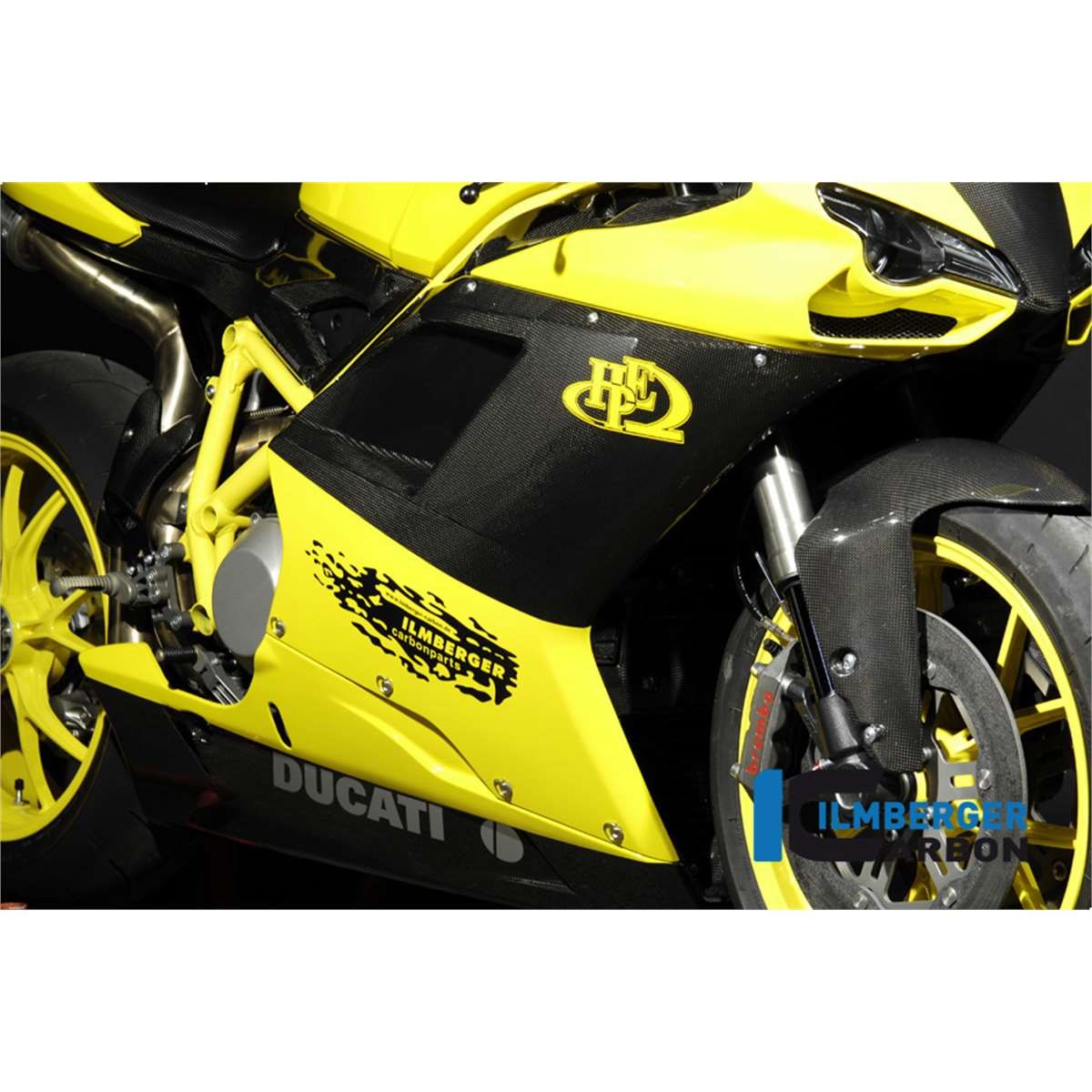 Das rechte Verkleidungsseitenteil in Carbon für die Ducati 848/1098/1198 ersetzt das originale Bauteil unter Verwendung der originalen Befestigungspunkte. Im Vordergrund stehen Gewichtsersparnis (in der Regel Einsparung von ca. 70% im Vergleich zum originalen Bauteil) und höhere Steifigkeit.  Das Carbonteil wurde nach den neuesten Richtlinien im Autoklaven komplett aus Prepreg (siehe FAQ) Material gefertigt und im nächsten Schritt, wie bei uns üblich, zum Schutz gegen Umwelteinflüße mit einer klaren Kunststoffbeschichtung überzogen.