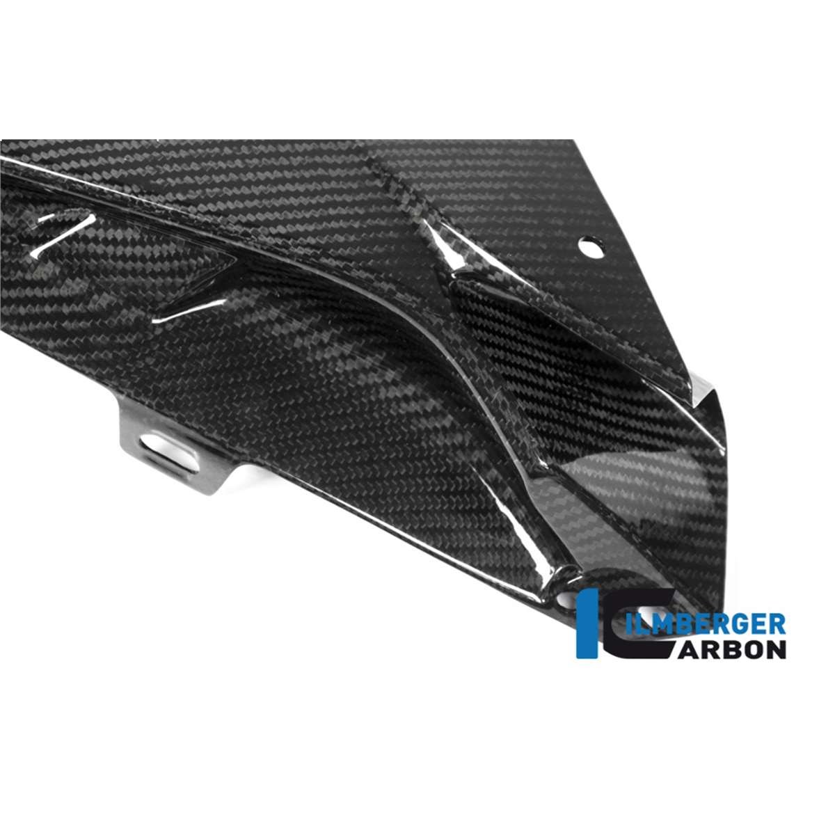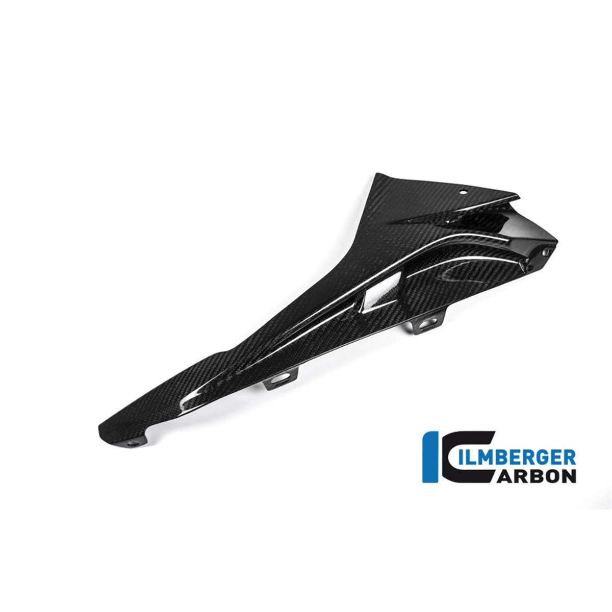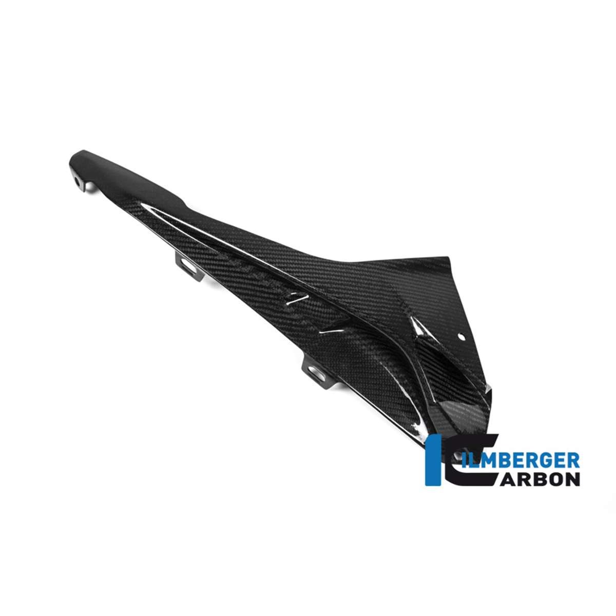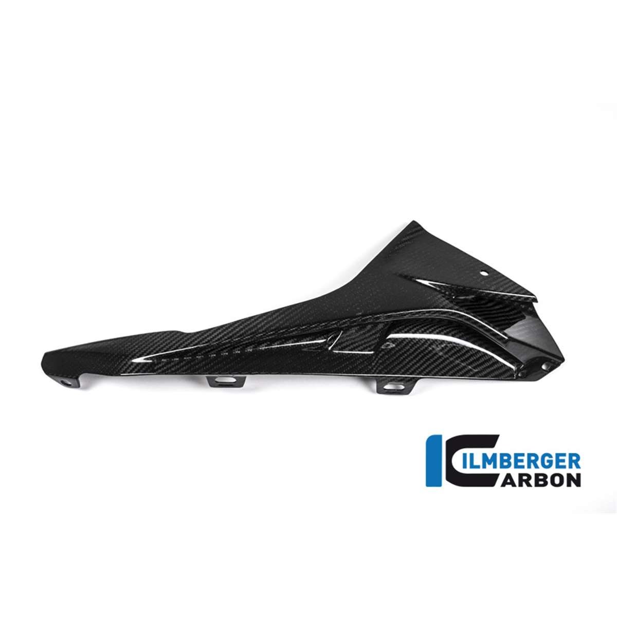 Der obere Teil des Verkleidungsseitenteils (ehemals Plakettenträger) in Carbon für die BMW S 1000 RR Straße (2015 – aktuell) ersetzt das originale Bauteil unter Verwendung der originalen Befestigungspunkte. Im Vordergrund stehen Gewichtsersparnis (in der Regel Einsparung von ca. 70% im Vergleich zum originalen Bauteil) und höhere Steifigkeit. Das Carbonteil wurde nach den neuesten Richtlinien im Autoklaven komplett aus Prepreg (siehe FAQ) Material gefertigt und im nächsten Schritt, wie bei uns üblich, zum Schutz gegen Umwelteinflüße mit einer klaren Kunststoffbeschichtung überzogen. Diese Kunststoffbeschichtung übertrifft den sonst üblichen Klarlacküberzug in der Schutzwirkung, Kratzfestigkeit und Beständigkeit enorm. Aber nicht nur technisch kann die Beschichtung punkten, sondern sie unterstreicht auch die dreidimensionale Wirkung der Carbonstruktur nochmals deutlich.