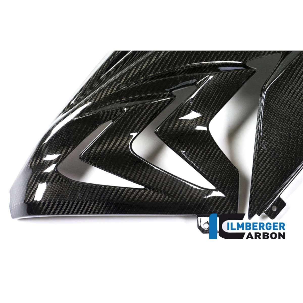 Das rechte Verkleidungsseitenteil Racing in Carbon für die BMW S 1000 RR ab 2015 ersetzt das originale Bauteil unter Verwendung der originalen Befestigungspunkte. Im Vordergrund stehen Gewichtsersparnis (in der Regel Einsparung von ca. 70% im Vergleich zum originalen Bauteil) und höhere Steifigkeit. Das Carbonteil wurde nach den neuesten Richtlinien im Autoklaven komplett aus Prepreg (siehe FAQ) Material gefertigt und im nächsten Schritt, wie bei uns üblich, zum Schutz gegen Umwelteinflüße mit einer klaren Kunststoffbeschichtung überzogen. Diese Kunststoffbeschichtung übertrifft den sonst üblichen Klarlacküberzug in der Schutzwirkung, Kratzfestigkeit und Beständigkeit enorm. Aber nicht nur technisch kann die Beschichtung punkten, sondern sie unterstreicht auch die dreidimensionale Wirkung der Carbonstruktur nochmals deutlich.