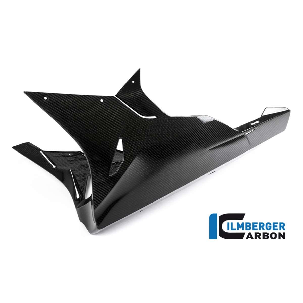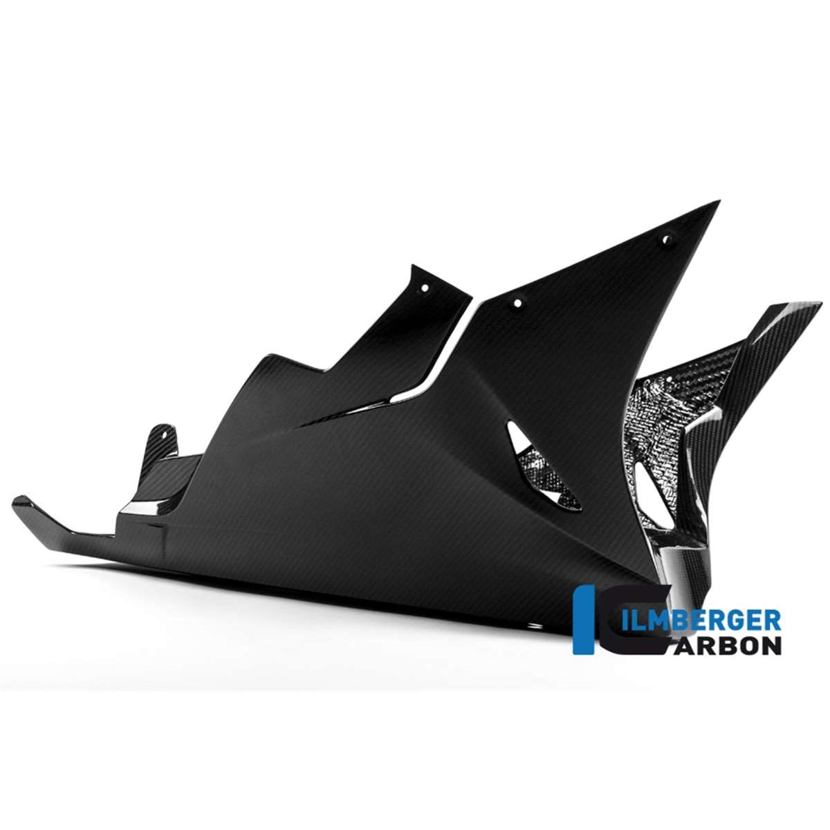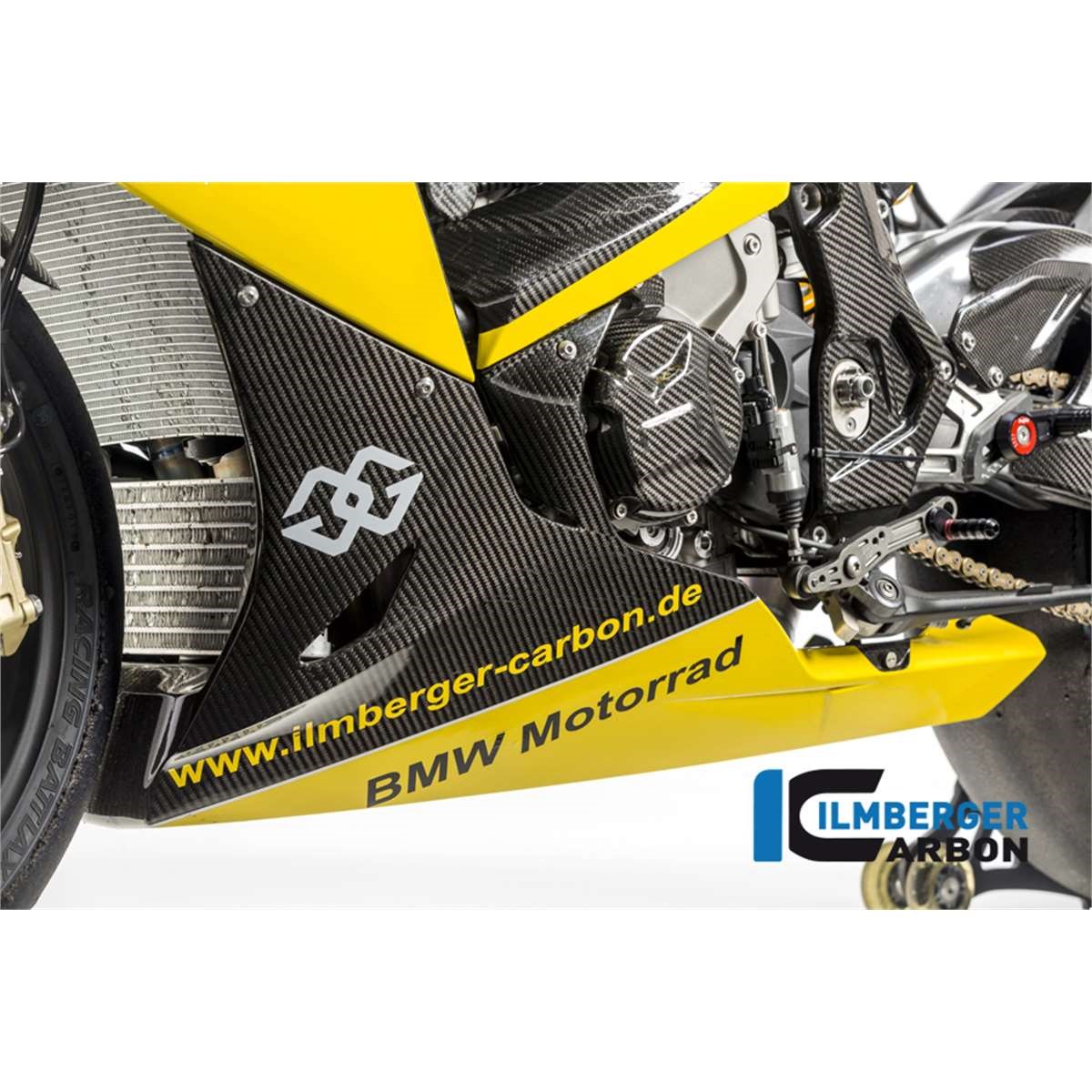 Das einteilige Racing Verkleidungsunterteil für die BMW S 1000 RR ab 2015 ist im unteren Bereich geschlossen ausgeführt. Das Verkleidungsunterteil ist so gestaltet, dass der originale Seitenständer weiterverwendet werden kann, es passt perfekt zur Racingverkleidung, kann jedoch auch mit serienmässigen Verkleidungsseitenteilen kombiniert werden. In diesem Fall muss jedoch der vordere Plastikeinsatz (Lufteinlass am Öl und Wasserkühler) auf Höhe der Trennung von Seitenteilen und Unterteil abgeschnitten werden, da der Lufteinlass zum Ölkühler am Racing Verkleidungsunterteil in Carbon fest angebracht ist. Zum Anbau des Racingverkleidungsuntereil wird der Verkleidungshaltersatz mit der Artikel Nr. VHK.351.S1R15.K benötigt.