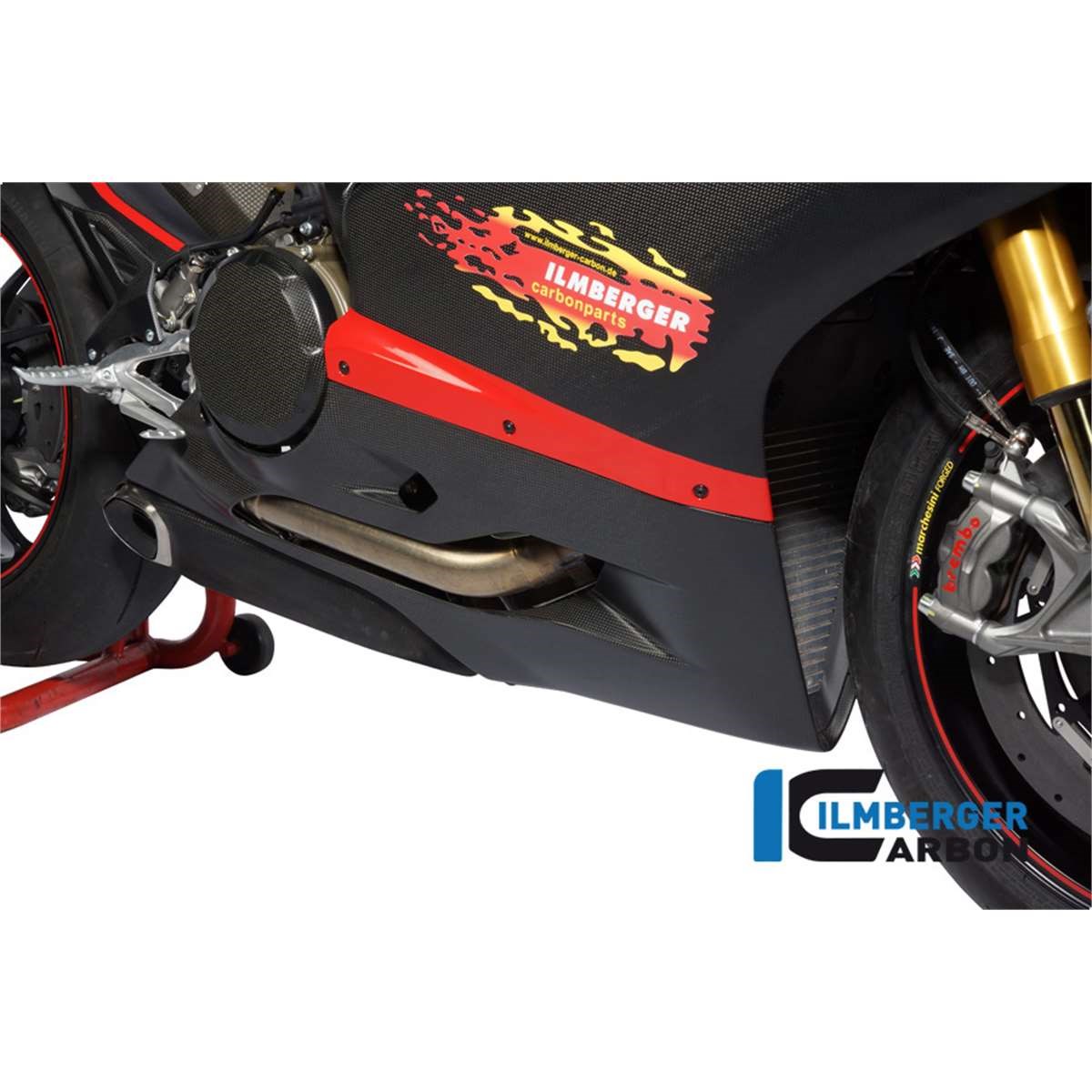 Das Verkleidungsunterteil in Carbon für die Ducati 1199 Panigale ersetzt das originale Bauteil unter Verwendung der originalen Befestigungspunkte. Im Vordergrund stehen Gewichtsersparnis (in der Regel Einsparung von ca. 70% im Vergleich zum originalen Bauteil) und höhere Steifigkeit.  Das Carbonteil wurde nach den neuesten Richtlinien im Autoklaven komplett aus Prepreg (siehe FAQ) Material gefertigt und im nächsten Schritt, wie bei uns üblich, zum Schutz gegen Umwelteinflüße mit einer klaren Kunststoffbeschichtung überzogen.