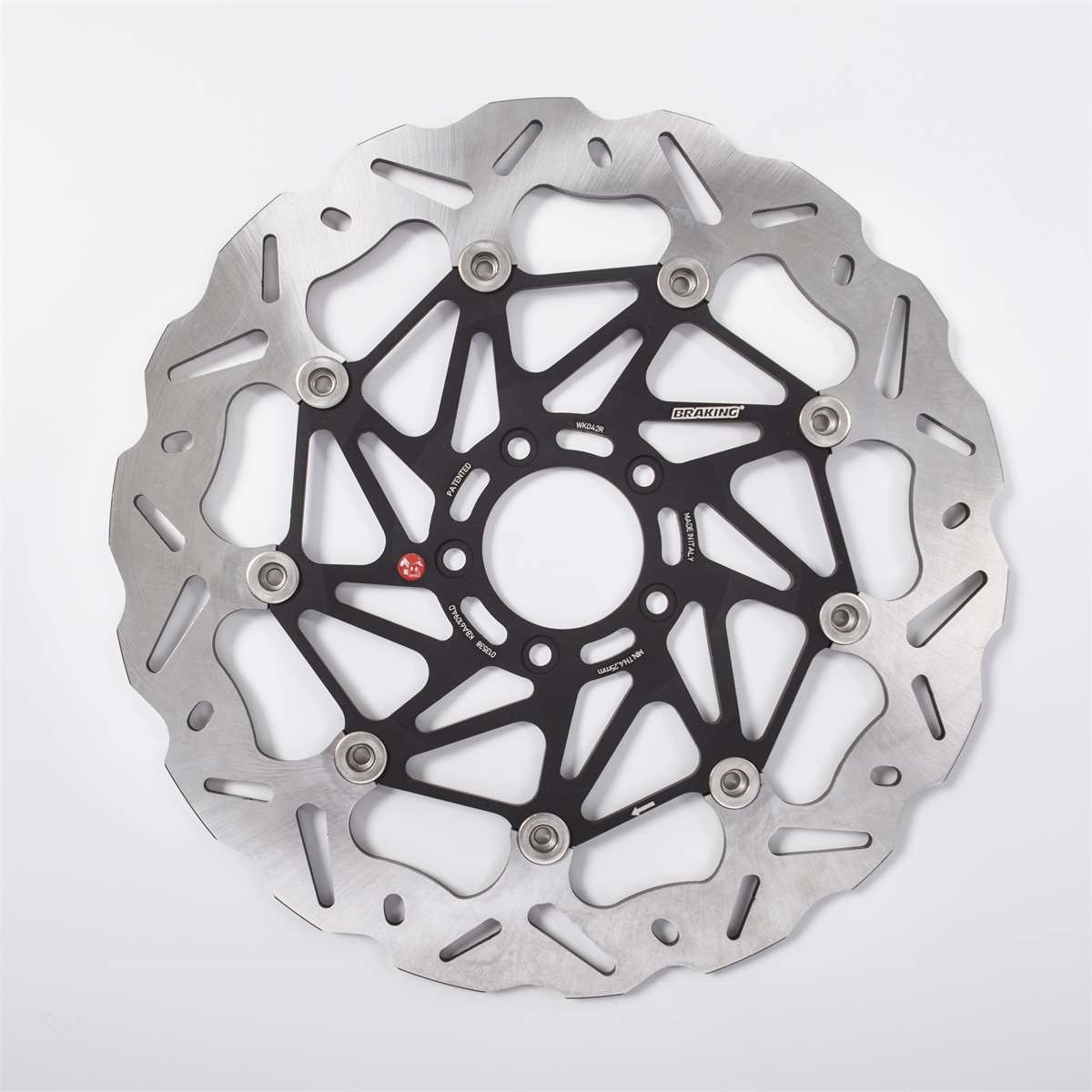 Bremsscheibe vollschwimmend mit gelochtem Stahlaussenring im Wave Design, Innenring aus Aluminium.