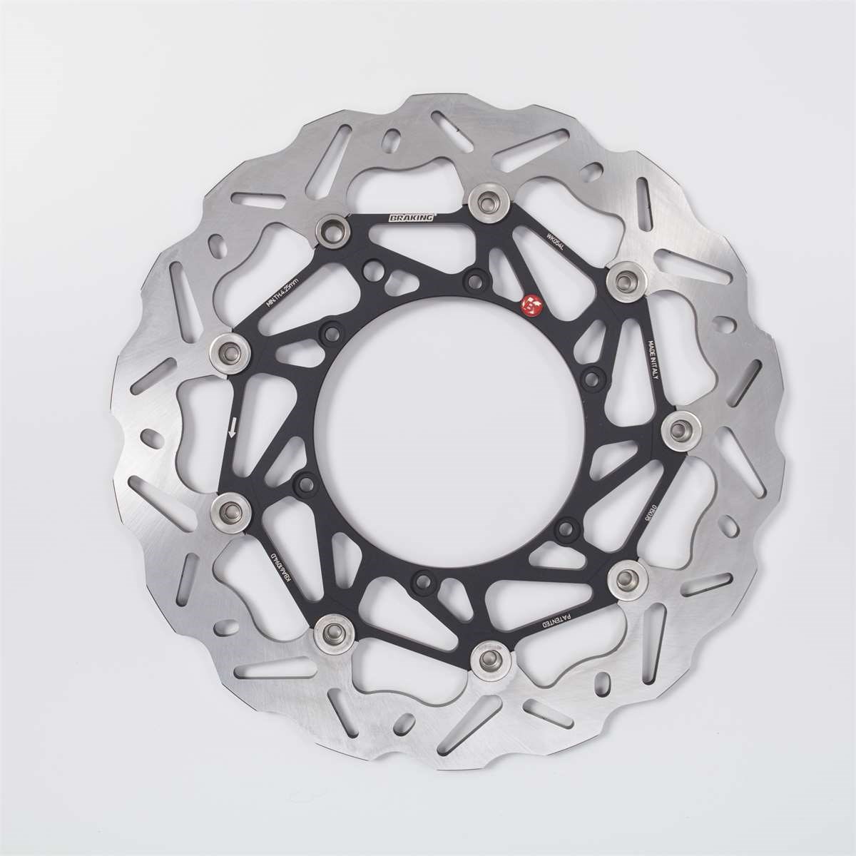Bremsscheibe vollschwimmend mit gelochtem Stahlaussenring im Wave Design, Innenring aus Aluminium.