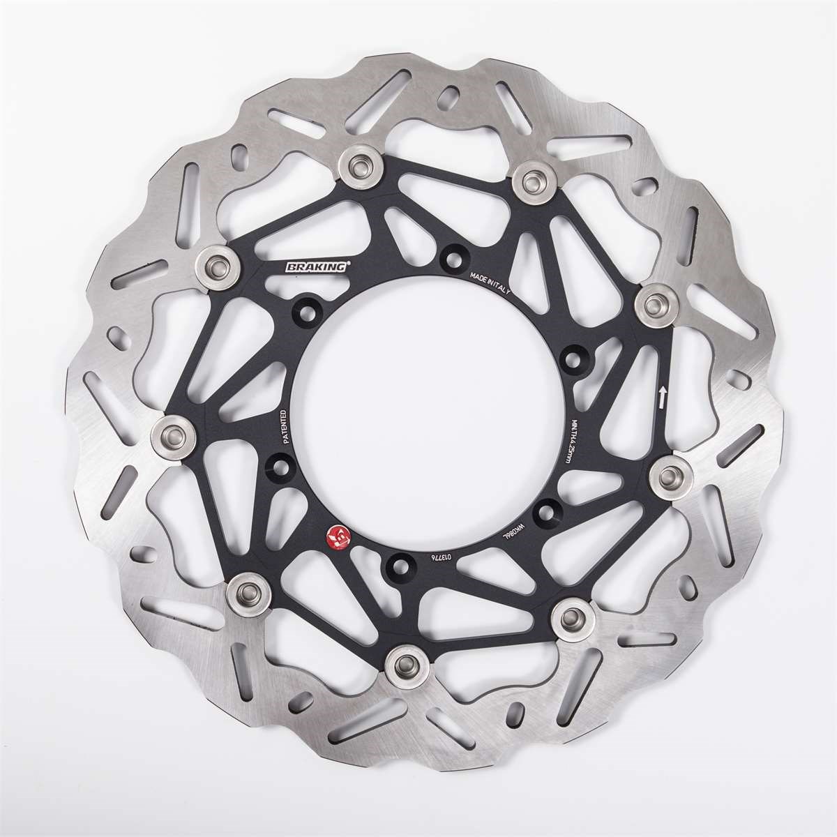 Bremsscheibe vollschwimmend mit gelochtem Stahlaussenring im Wave Design, Innenring aus Aluminium.