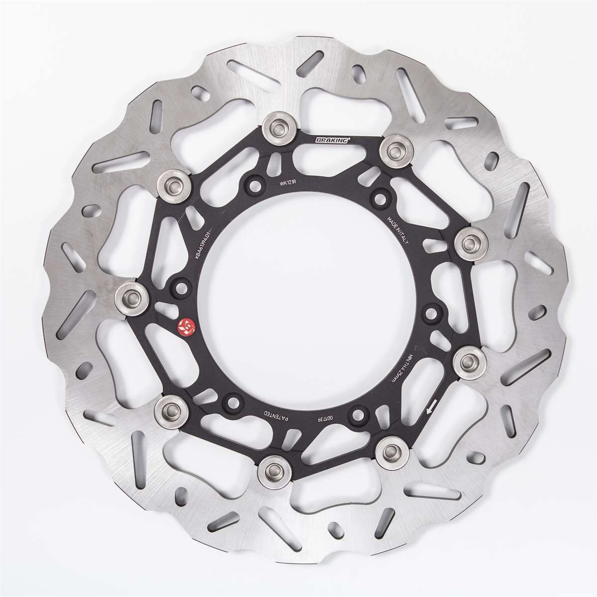 Bremsscheibe vollschwimmend mit gelochtem Stahlaussenring im Wave Design, Innenring aus Aluminium.