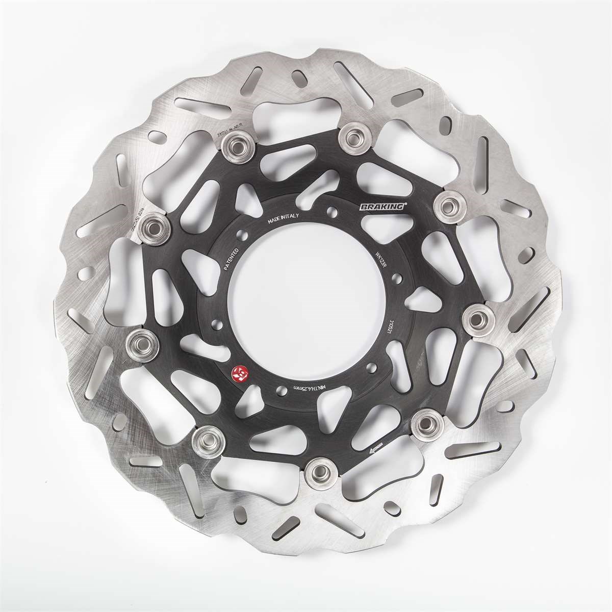 Bremsscheibe vollschwimmend mit gelochtem Stahlaussenring im Wave Design, Innenring aus Aluminium.