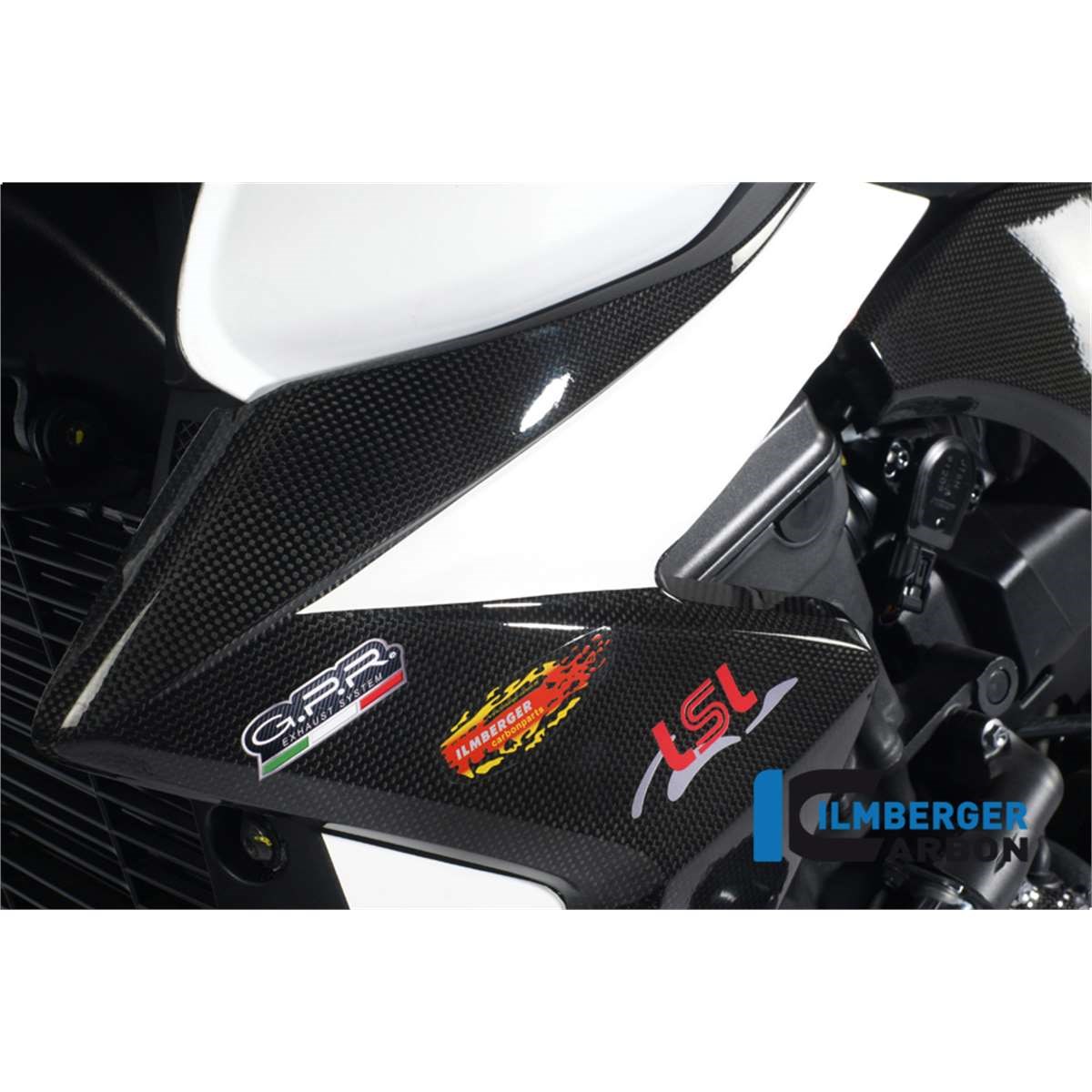 Die Wasserkühlerverkleidung in Carbon für die Honda CB 1000 R  ersetzt das originale Bauteil unter Verwendung der originalen Befestigungspunkte. Im Vordergrund stehen Gewichtsersparnis (in der Regel Einsparung von ca. 70% im Vergleich zum originalen Bauteil) und höhere Steifigkeit.  Das Carbonteil wurde nach den neuesten Richtlinien im Autoklaven komplett aus Prepreg (siehe FAQ) Material gefertigt und im nächsten Schritt, wie bei uns üblich, zum Schutz gegen Umwelteinflüße mit einer klaren Kunststoffbeschichtung überzogen.