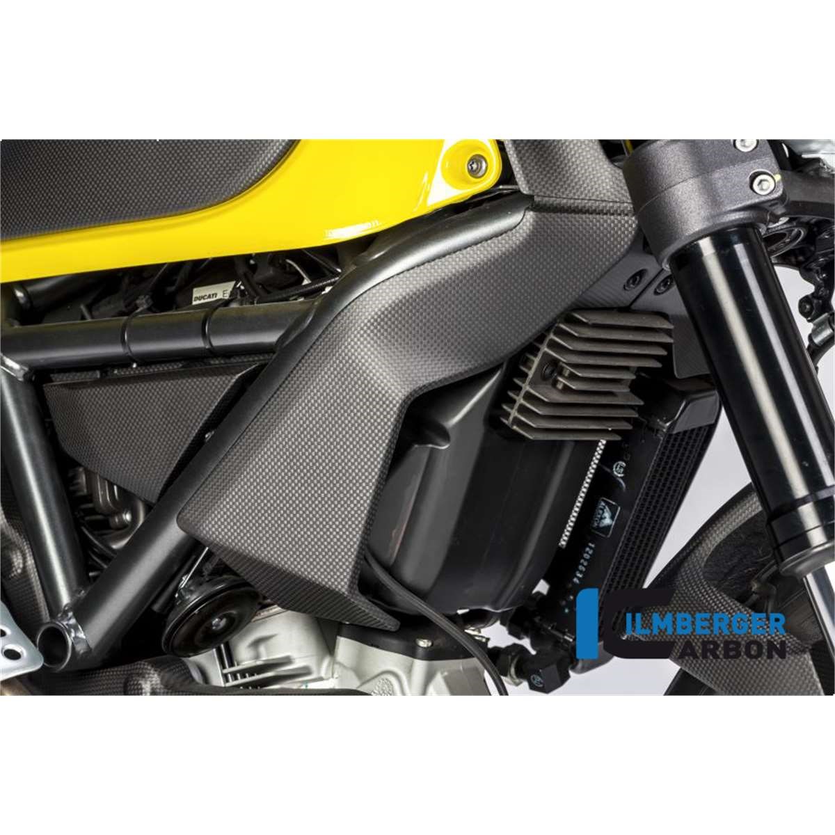 Die rechte Wasserkühlerverkleidung in Carbon und matter Ausführung für die Ducati Scrambler ab 2016 wird an vorhandenen Haltepunkten am Fahrzeug aufgeschraubt.