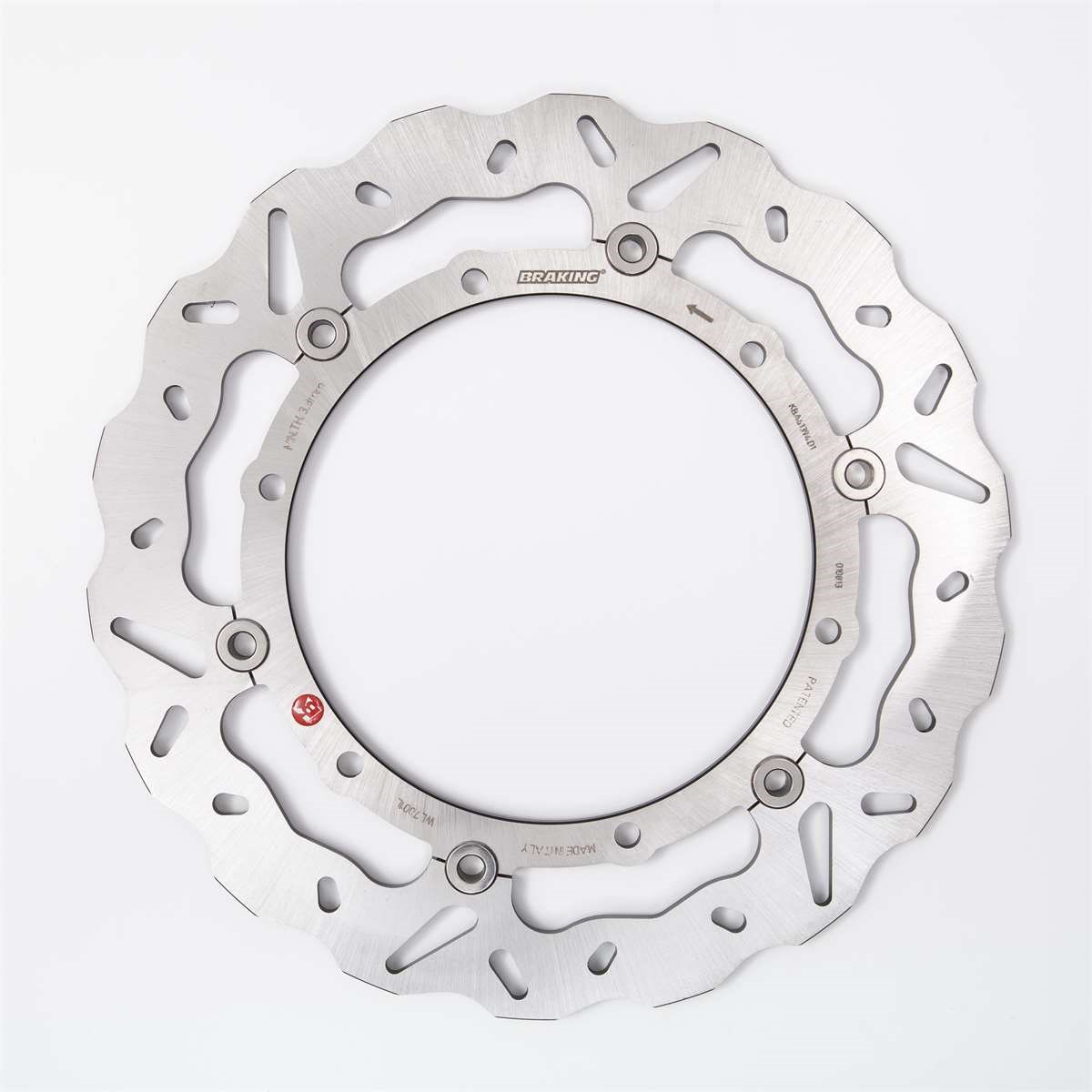 Bremsscheibe vollschwimmend mit gelochtem Stahlaussenring im Wave Design, Innenring aus Aluminium.