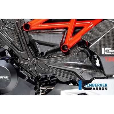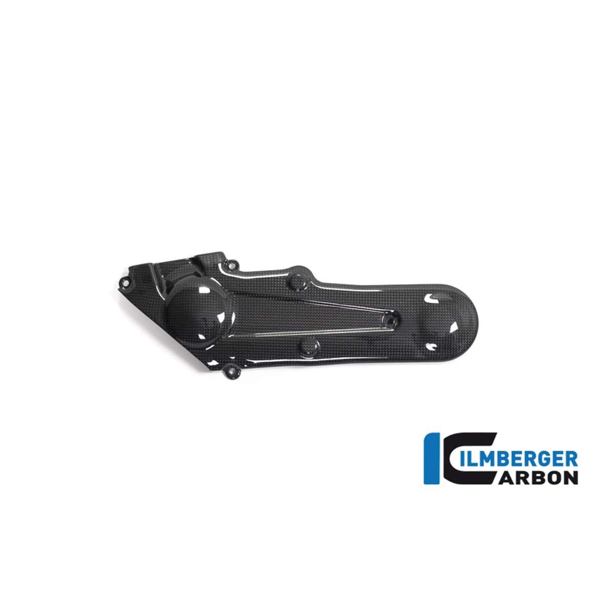 Die horizontale Zahnriemenabdeckung in Carbon und glänzender Ausführung für die Ducati Scrambler ab 2016 wird an vorhandenen Haltepunkten am Fahrzeug aufgeschraubt.