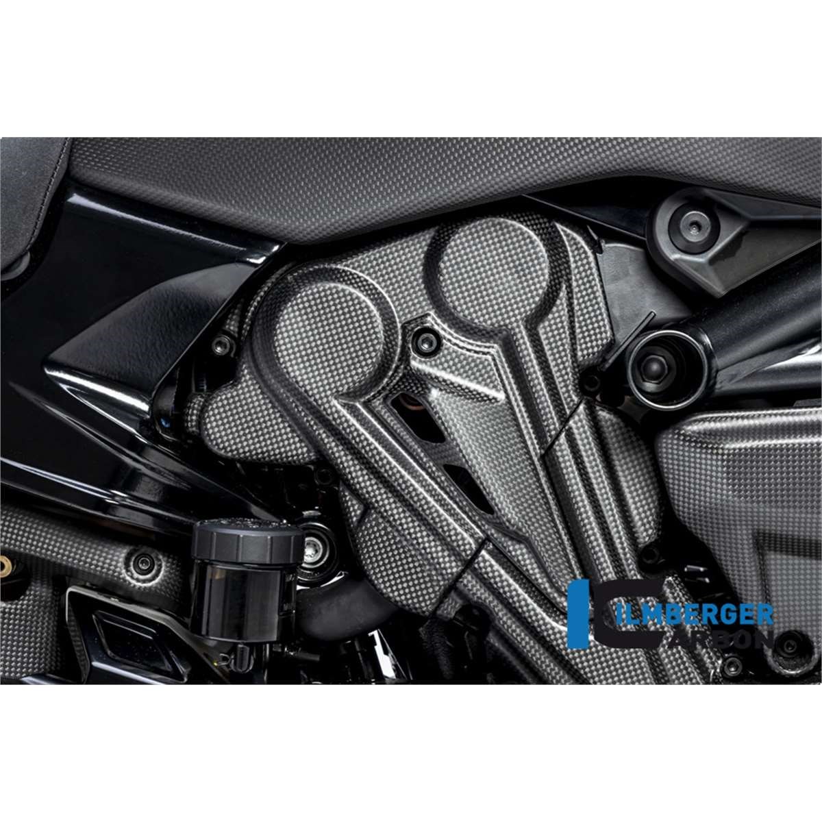 Die Zahnriemenabdeckung für den vertikalen Zylinder aus Carbon und in matter Ausführung für die Ducati Diavel 1260 ab 2019 wird an vorhandenen Haltepunkten am Fahrzeug aufgeschraubt. Die Montage der Teile erfolgt über die Verwendung originaler Aufnahmepunkte. Das Carbonteil wurde nach den neuesten Richtlinien im Autoklaven komplett aus Prepreg (siehe FAQ) Material gefertigt und im nächsten Schritt, wie bei uns üblich, zum Schutz gegen Umwelteinflüße mit einer klaren Kunststoffbeschichtung überzogen. Diese Kunststoffbeschichtung übertrifft den sonst üblichen Klarlacküberzug in der Schutzwirkung, Kratzfestigkeit und Beständigkeit enorm. Aber nicht nur technisch kann die Beschichtung punkten, sondern sie unterstreicht auch die dreidimensionale Wirkung der Carbonstruktur nochmals deutlich.