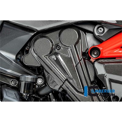 Die vertikale Zahnriemenabdeckung in Carbon für die Ducati Supersport 939 wird mit matt lackierter Oberfläche ausgeliefert und fügt sich somit hervorragend ins Gesamtbild der originalen Ducati und Ducati Performance Teile ein.