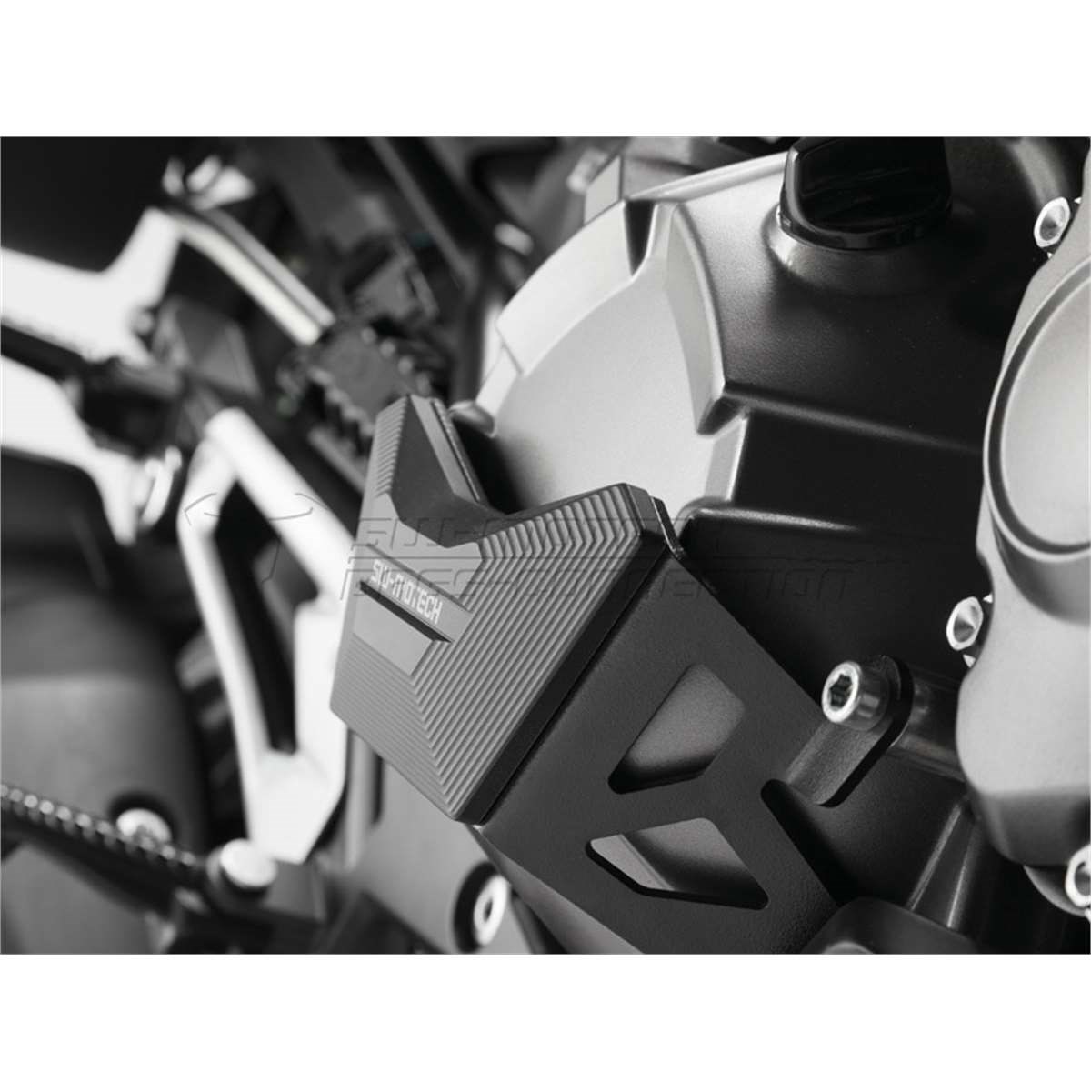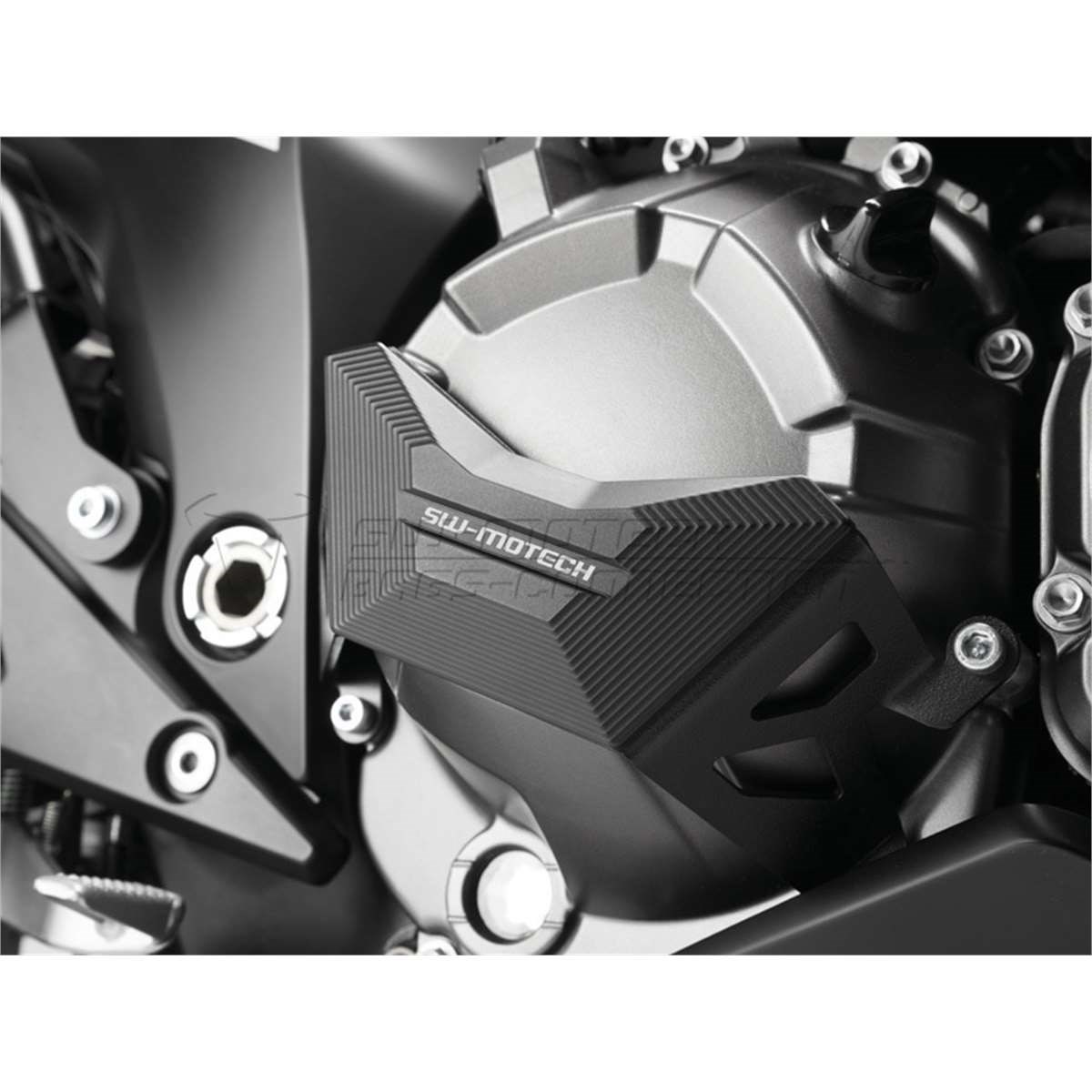 Zum Schutz der Motordeckel gegen Steinschläge und Stürze. Speziell der Form des Motordeckels angepasst und an der Innenseite mit einer Gummidämpfung versehen. Eine Kombination aus gelasertem, pulverbeschichteten Grundrahmen aus Stahl und CNC-gefrästem, schwarz eloxiertem Aluminium-Pad.