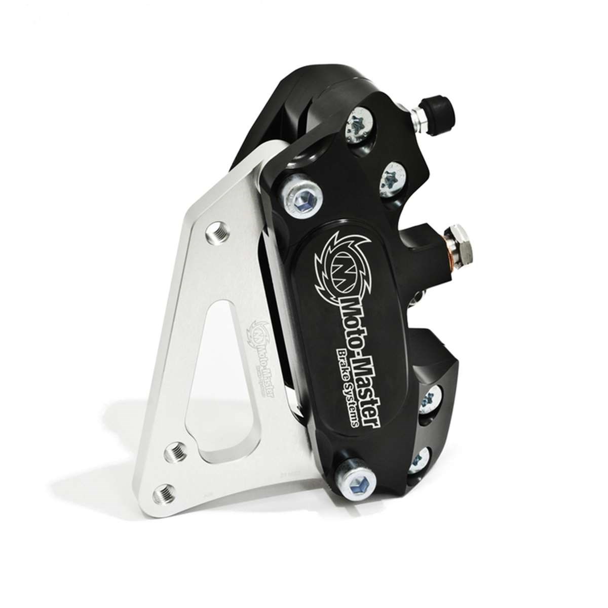 Hochwertige, CNC gefräste 4-Kolben Bremszange mit Adapter für 320 mm Bremsscheibe. Montage nur in Verbindung mit 16" oder 17" Supermoto-Vorderrad.