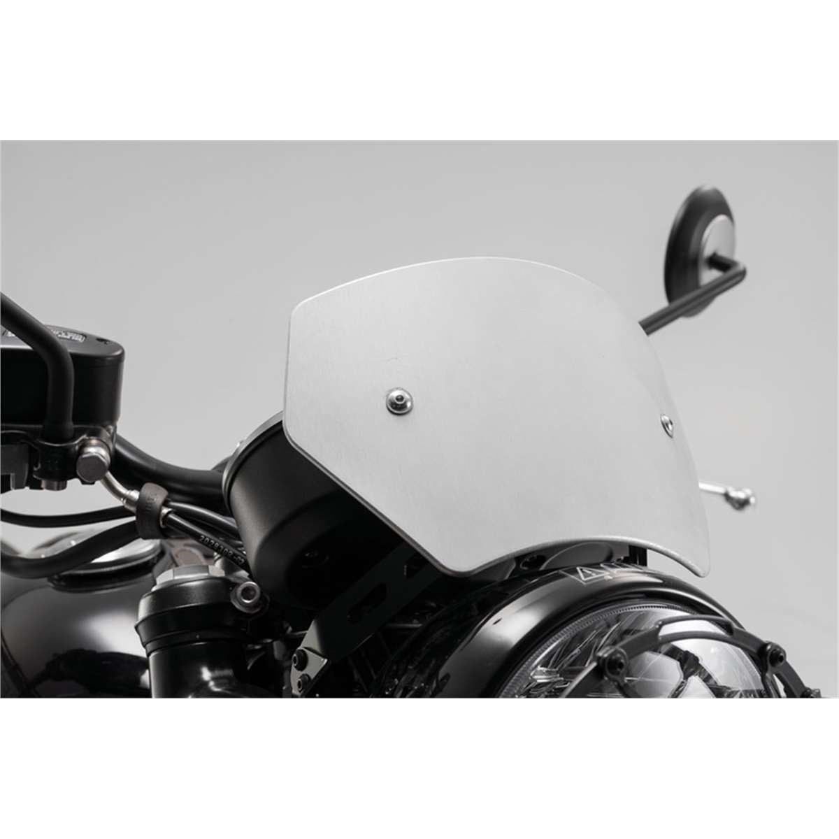 Das Windschild aus gebürstetem Aluminium verleiht jedem Motorrad eine individuelle Note - besonders in Kombination mit weiterem Zubehör wie dem Kotflügel-Kit oder den Mini-Blinkern.