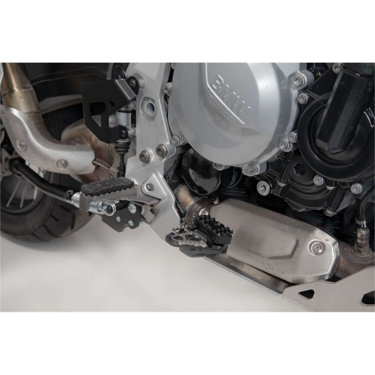 SW-MOTECH fertigt die Erweiterungen aus gefräster und hochfester Aluminiumlegierung mit schwarz eloxierter Oberfläche und mit einem Auftrittsblech in Edelstahl. Für eine optimale Anpassung an die Ergonomie lässt sich die Erhöhung des Bremshebelauftritt in zwei Stufen von 22 oder 27 Millimetern einstellen.