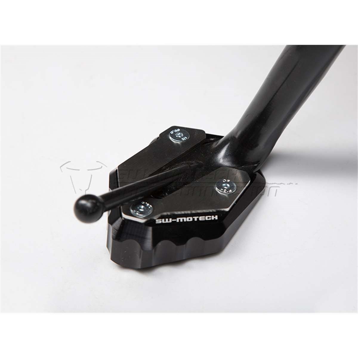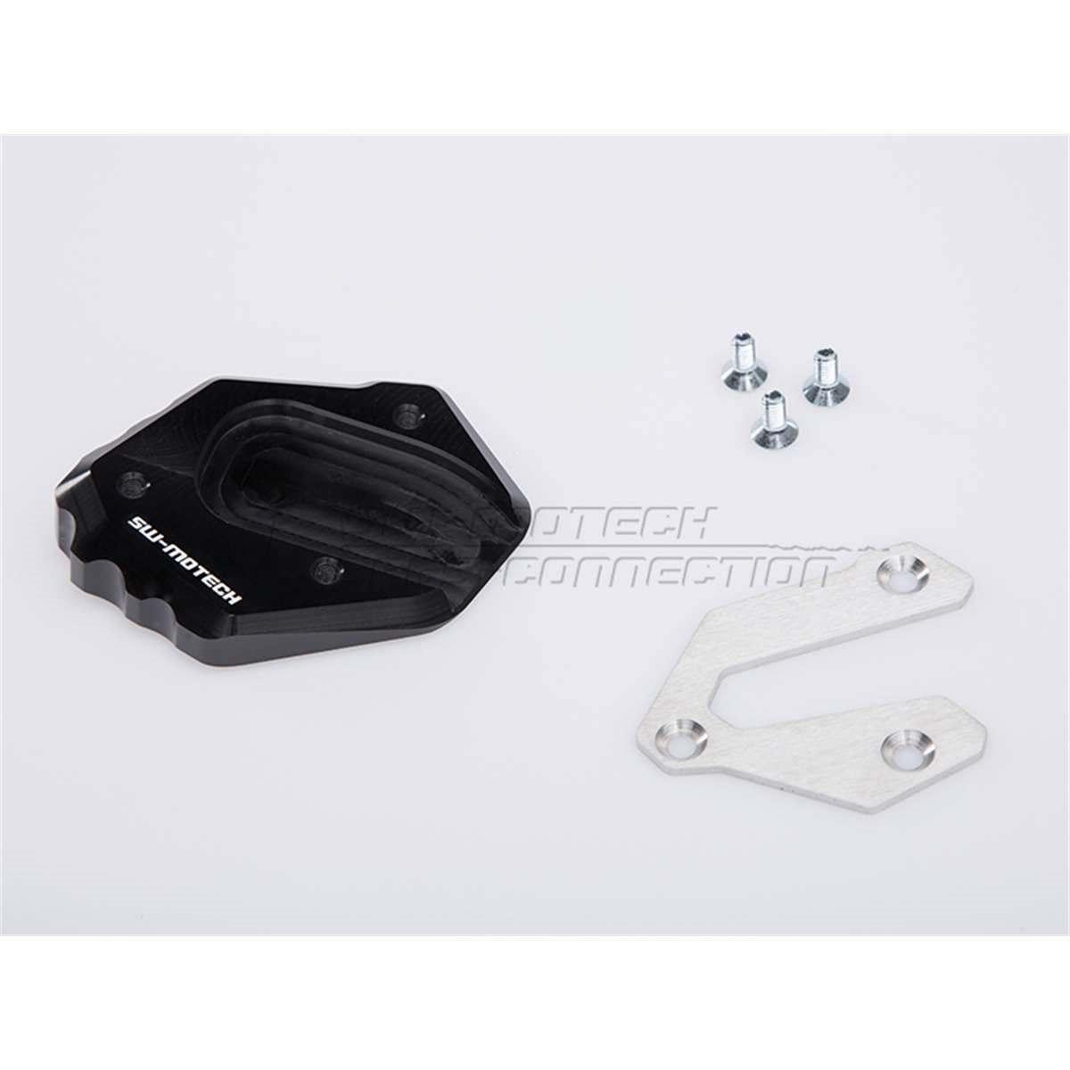 Die formschöne Fussverbreiterung ist aus hochfester Aluminium-Legierung CNC-gefrässt. Dank der grosszügigen Auflagefläche wird ein Versinken auf weichem Untergrund verhindert. Der Verbreiterungsfuss ist silber eloxiert, das obere Anbaublech schwarz pulverbeschichtet.