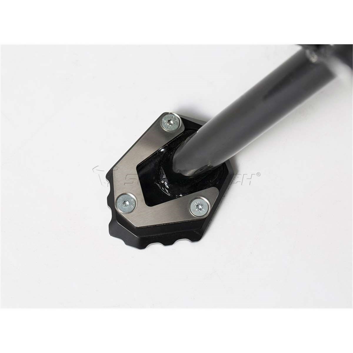 Die formschöne Fussverbreiterung ist aus hochfester Aluminium-Legierung CNC-gefrässt. Dank der grosszügigen Auflagefläche wird ein Versinken auf weichem Untergrund verhindert. Der Verbreiterungsfuss ist silber eloxiert, das obere Anbaublech schwarz pulverbeschichtet.