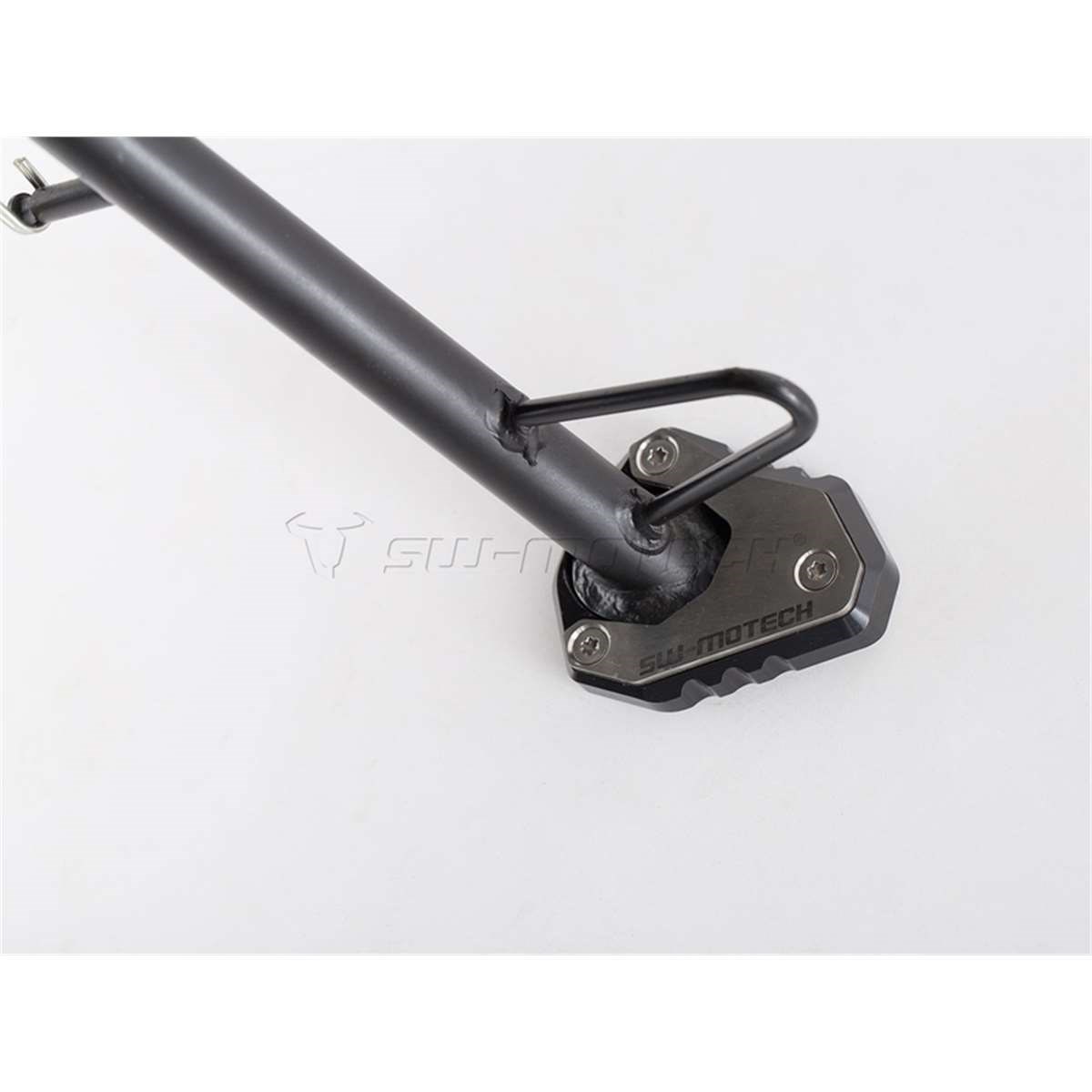 Die formschöne Fussverbreiterung ist aus hochfester Aluminium-Legierung CNC-gefrässt. Dank der grosszügigen Auflagefläche wird ein Versinken auf weichem Untergrund verhindert. Der Verbreiterungsfuss ist silber eloxiert, das obere Anbaublech schwarz pulverbeschichtet.