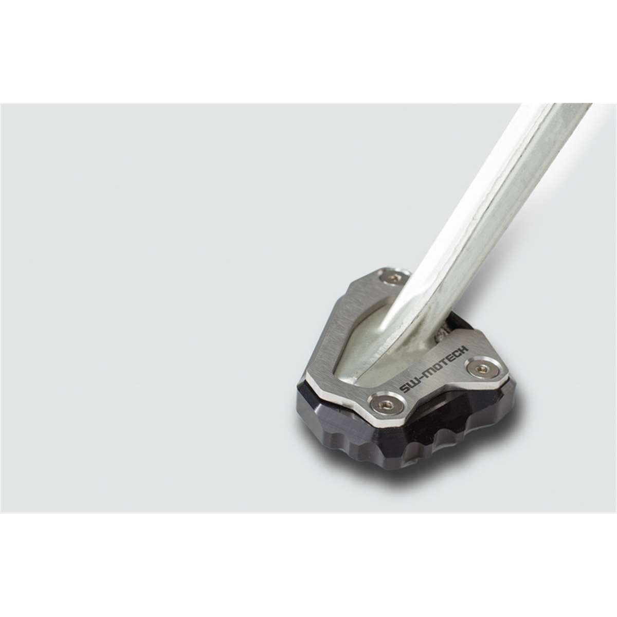 Die formschöne Fussverbreiterung ist aus hochfester Aluminium-Legierung CNC-gefrässt. Dank der grosszügigen Auflagefläche wird ein Versinken auf weichem Untergrund verhindert. Der Verbreiterungsfuss ist silber eloxiert, das obere Anbaublech schwarz pulverbeschichtet.