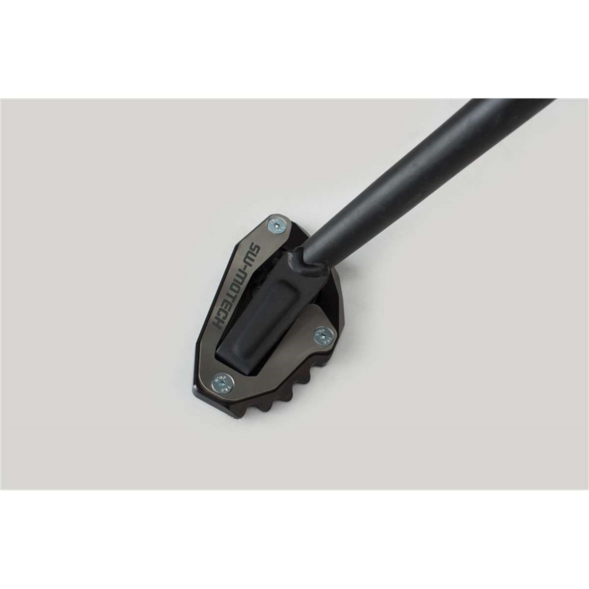 Die formschöne Fussverbreiterung ist aus hochfester Aluminium-Legierung CNC-gefrässt. Dank der grosszügigen Auflagefläche wird ein Versinken auf weichem Untergrund verhindert. Der Verbreiterungsfuss ist silber eloxiert, das obere Anbaublech schwarz pulverbeschichtet.