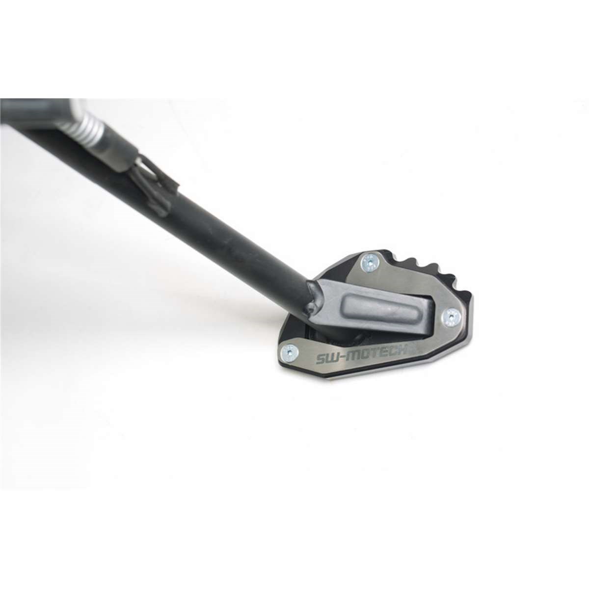 Die formschöne Fussverbreiterung ist aus hochfester Aluminium-Legierung CNC-gefrässt. Dank der grosszügigen Auflagefläche wird ein Versinken auf weichem Untergrund verhindert. Der Verbreiterungsfuss ist silber eloxiert, das obere Anbaublech schwarz pulverbeschichtet.