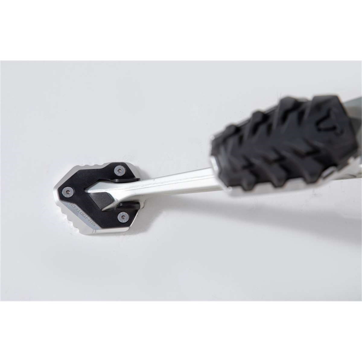Die formschöne Fussverbreiterung ist aus hochfester Aluminium-Legierung CNC-gefrässt. Dank der grosszügigen Auflagefläche wird ein Versinken auf weichem Untergrund verhindert. Der Verbreiterungsfuss ist silber eloxiert, das obere Anbaublech schwarz pulverbeschichtet.