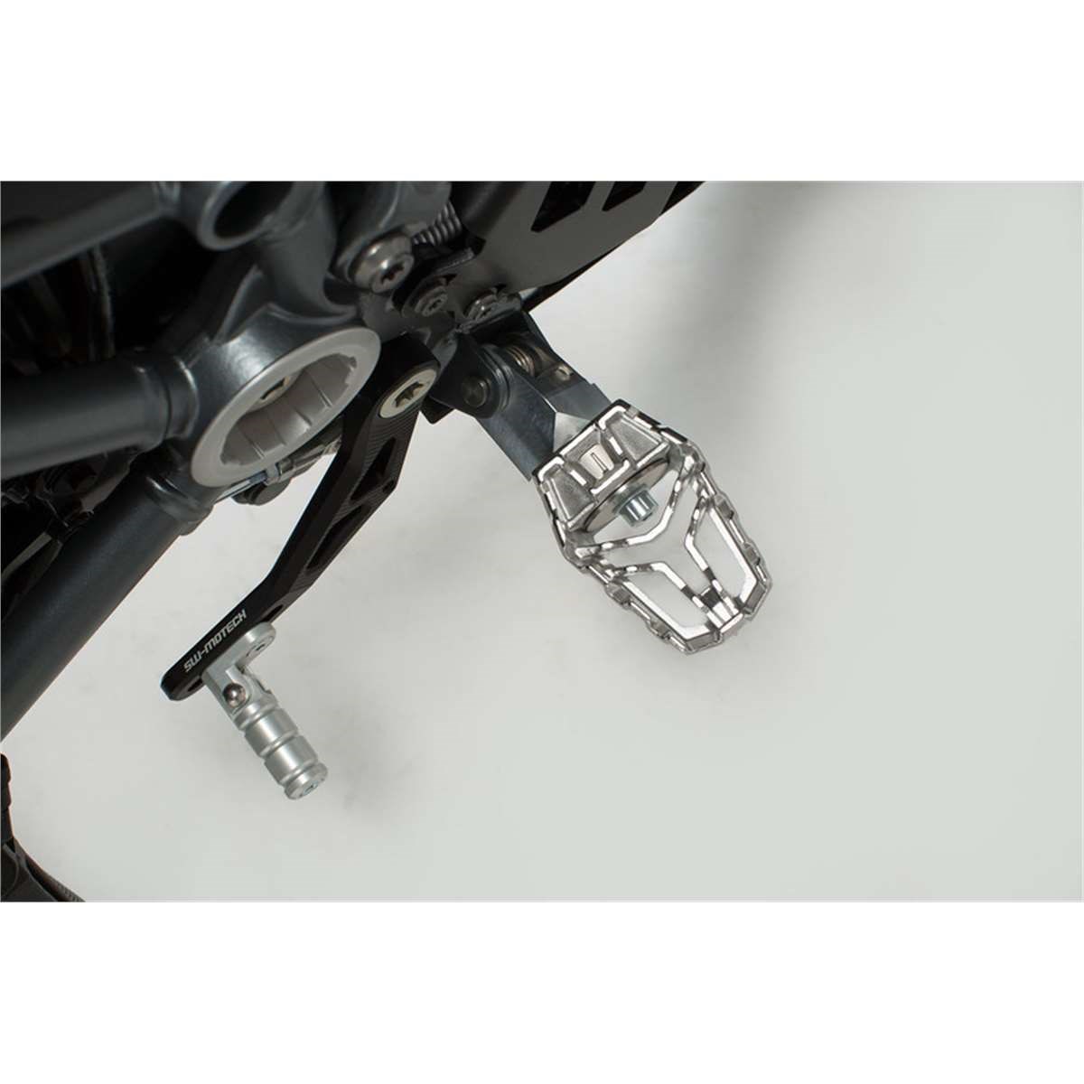 La position n'est pas confortable avec le repose-pied d'origine ? Nous proposons alors la solution idéale : le kit de repose-pieds EVO de SW-MOTECH. Un système ingénieux, composé d?éléments rotatifs à dents fixes qui s'emboîtent, permet 36 possibilités différentes. Le repose-pieds peut être réglé vers l'arrière, l'avant et le bas, et aussi incliné selon les besoins de chaque pilote. Les adaptateurs articulés se montent simplement avec les pièces d'origine sur les supports de repose-pieds. Une notice d'installation explique comment ça marche.