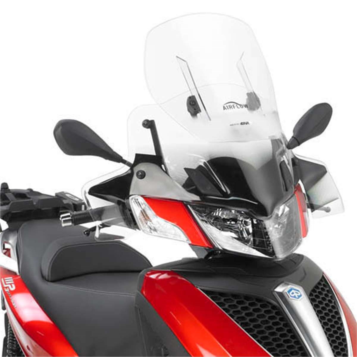 AIRFLOW verstärkt das Niveau der Vielseitigkeit einer Scheibe. Dank des höhenverstellbaren Spoilers kann dieser Windschutz in wenigen Sekunden bequem der Sitzhöhe des Fahrers bzw. den jeweiligen Wetterbedingungen angepasst werden. Der bewegliche Teil des Windschutzsystems ist aus transparentem Polykarbonat. Dieser lässt sich auf zwei Schienen um bis zu 12 cm verschieben und mit Hilfe von zwei robusten Klemmen aus Kunststoff in die vom Fahrer gewu?nschte Position bringen. Die besondere Formgebung der festen und beweglichen Teile, aus denen das AIRFLOW System besteht, verleiht dem Windschild aerodynamische Eigenschaften, die jeder Turbolenzbildung entgegenwirken und besten Windschutz bieten. Ein weiteres wichtiges Plus von AIRFLOW ist die erhöhte Fahrsicherheit bei Regen: der Spoiler kann vollkommen herabgesenkt werden, womit der Störfaktor von Tropfen auf der Scheibe, die die Sicht verzerren und besonders bei eintretender Dunkelheit beeinträchtigen, vollständig behoben wird. AIRFLOW bietet noch einen interessanten Vorteil: der Spoiler kann leicht abgenommen werden und ermöglicht dem Scooter in warmen Sommerperioden nur mit dem unteren Teil des Windschildes zu fahren.