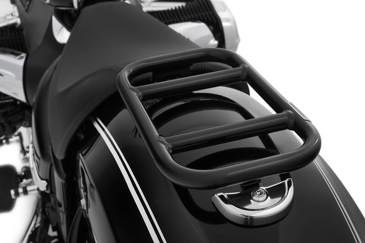 Dieser Gepäckträger ist die leicht zugängliche und flexibel nutzbare Lösung für alle BMW R18 Fahrer, die, allein unterwegs, gerne Taschen oder sonstiges Reisegepäck cruisergerecht und sicher unterbringen möchten. Auf Reisen spielt er sein Potential in Kombination mit unseren Seiten- und Satteltaschen - oder denen von BMW - aus und nimmt zusätzliches Gepäck auf.